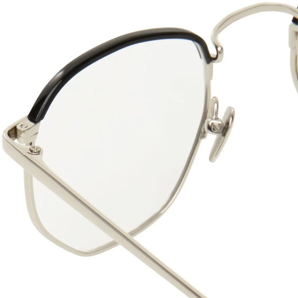 These angular Linda Farrow optical glasses are handcrafted with 18-22 carat white gold plated titanium frames, contoured with a black Italian acetate half Windsor rim. With a raised feature nose bridge, streamlined, co-ordinating slim temples are tapered with characteristic Japanese bulb tips, with the Linda Farrow logo in signature white inside of the temple. Adjustable nose pads provide superior levels of comfort.