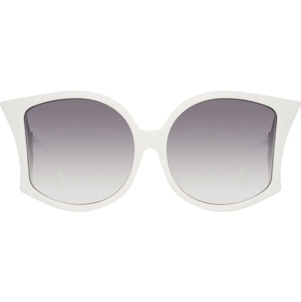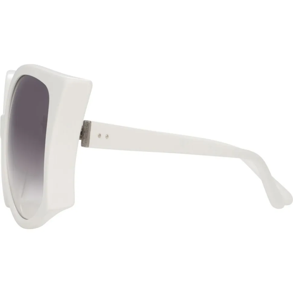 In an oversized winged Jackie O silhouette, the Lerreta brings inspiration from the heyday of the jet set captured by Slim Aarons with luxurious design. Crafted from white Italian acetate with co-ordinating grey to clear gradient nylon lenses, these Linda Farrow sunglasses are heavily bevelled for a glamorous finish, with signature details including tapered temples, 18-22 carat white gold-plated raised pins and temple capping. Due to the very light tint on these sunglasses, we recommend wearing for fashion use only.