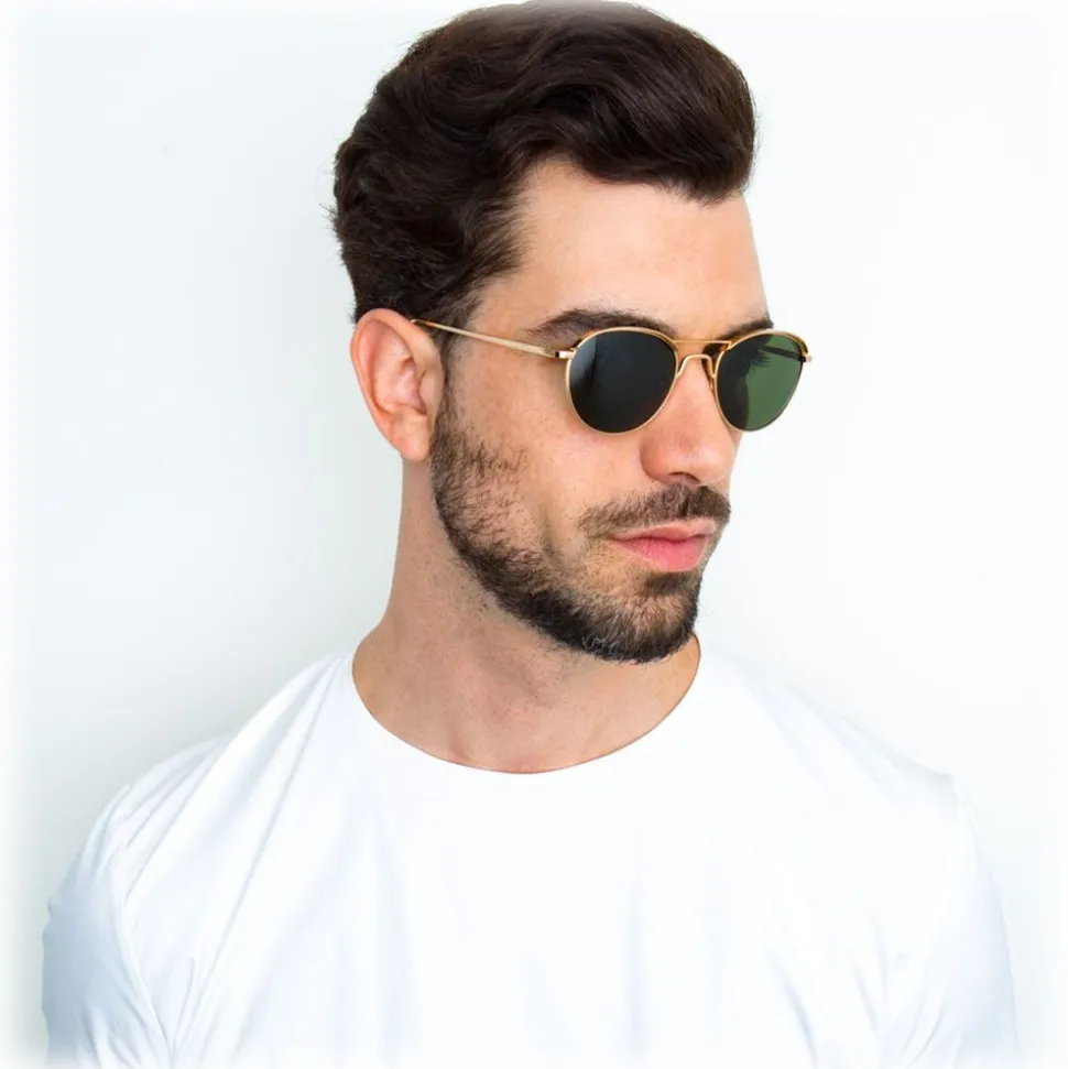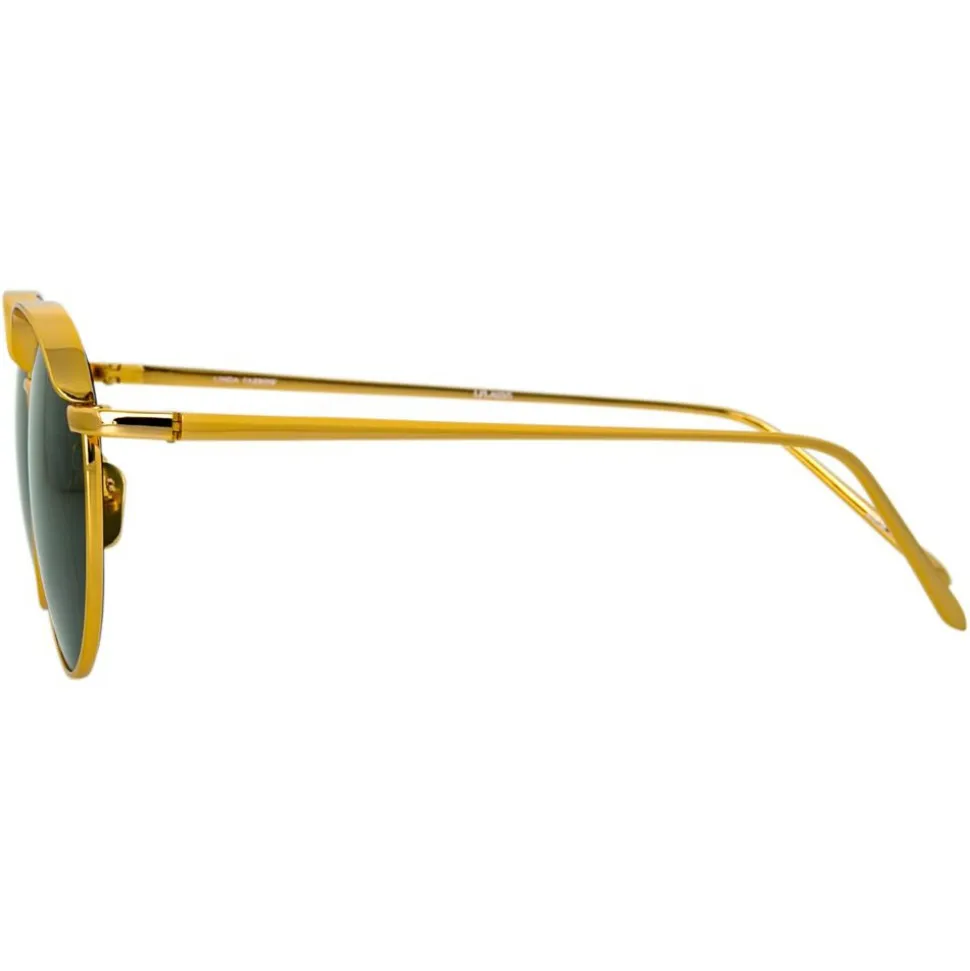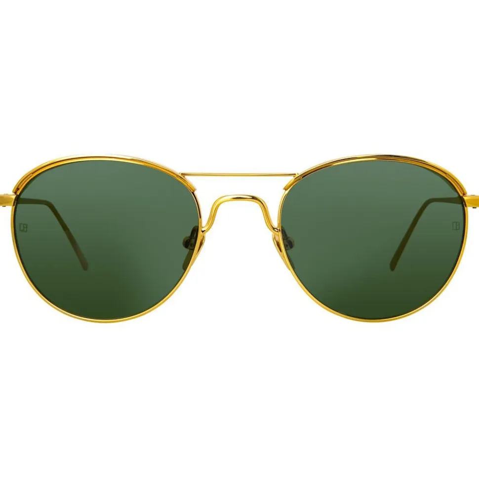 A luxurious update on a timeless silhouette, these men’s oval Linda Farrow sunglasses are handcrafted entirely from 18 – 22 carat yellow gold-plated Japanese lightweight titanium. Paired with contrasting green nylon lenses, this key style is elevated with subtle lip capping to the top of the lens, a raised feature nose bridge and contrasting flat top bar, with signature finishes including tapered temples with Japanese bulb tips and the Linda Farrow logo printed in white on the inside of the temple.