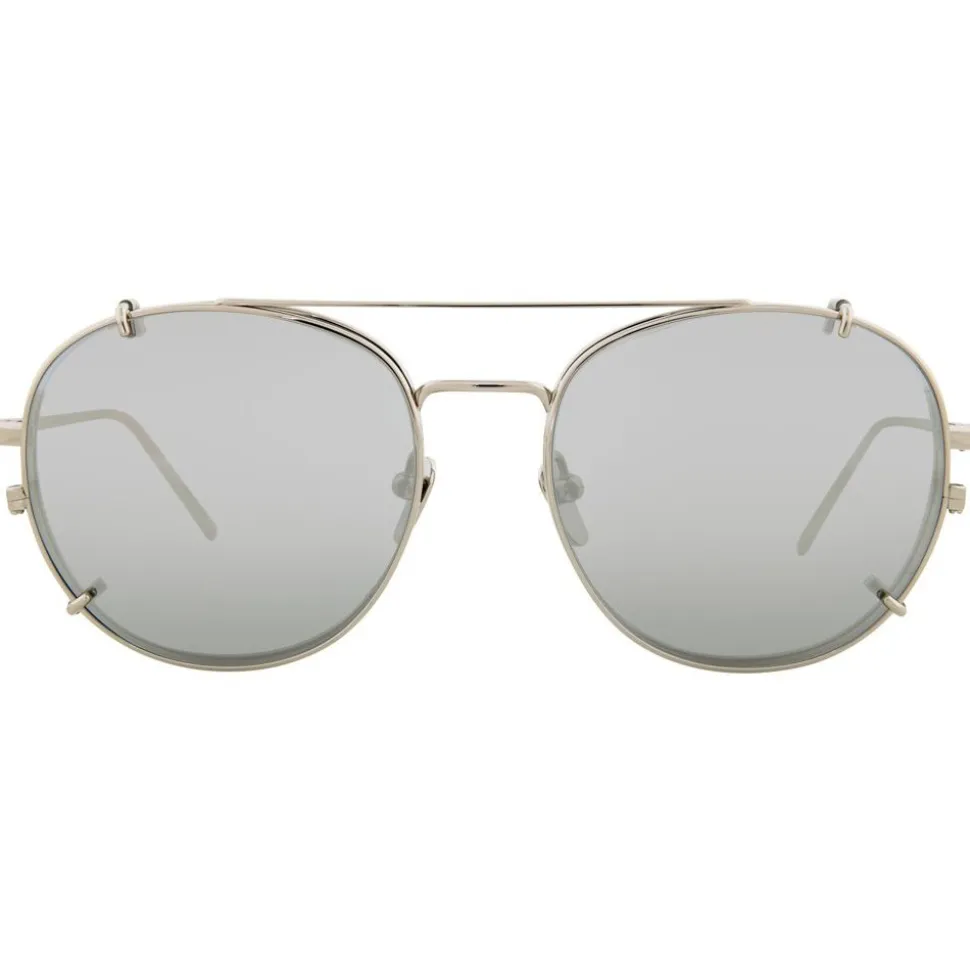 Combining luxurious materials with an innovative clip-on feature, these oval glasses bring optical and sunglasses together, enabling prescription wearers to wear precious lenses. Handcrafted entirely from 18-22 carat white gold-plated titanium with co-ordinating platinum precious lenses, the sunglasses features a top bar which clips on to co-ordinating frames.