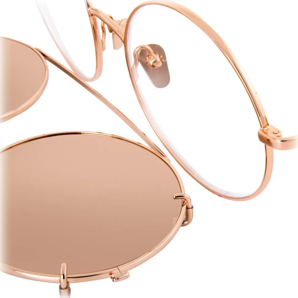 Handcrafted entirely from 18-22 carat rose gold-plated titanium with co-ordinating rose gold precious lenses, these sunglasses feature a curved nose bridge with a top bar that clips on to co-ordinating frames.