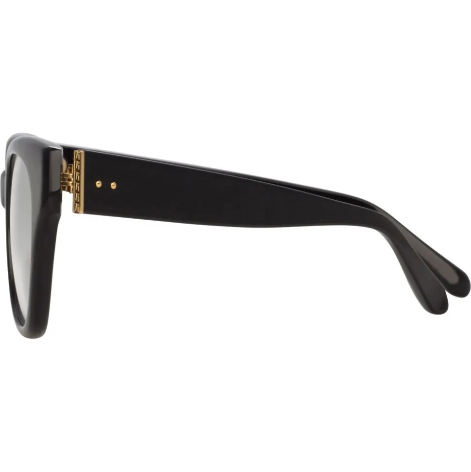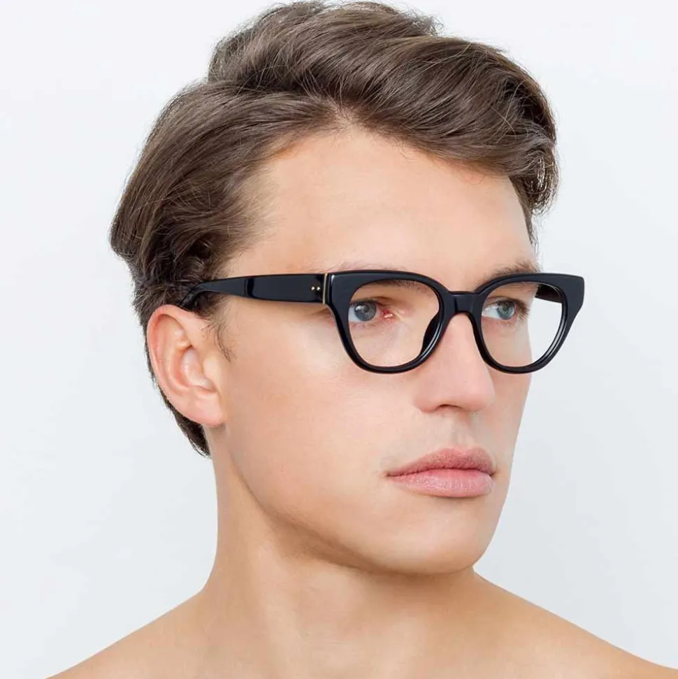 In a classic D-Frame silhouette reimagined in chunky luxurious black Italian acetate, these unisex Linda Farrow optical glasses are heavily bevelled and detailed with yellow gold-plated temple capping and raised pin details for a luxurious finish. Tapered temples provide superior comfort.