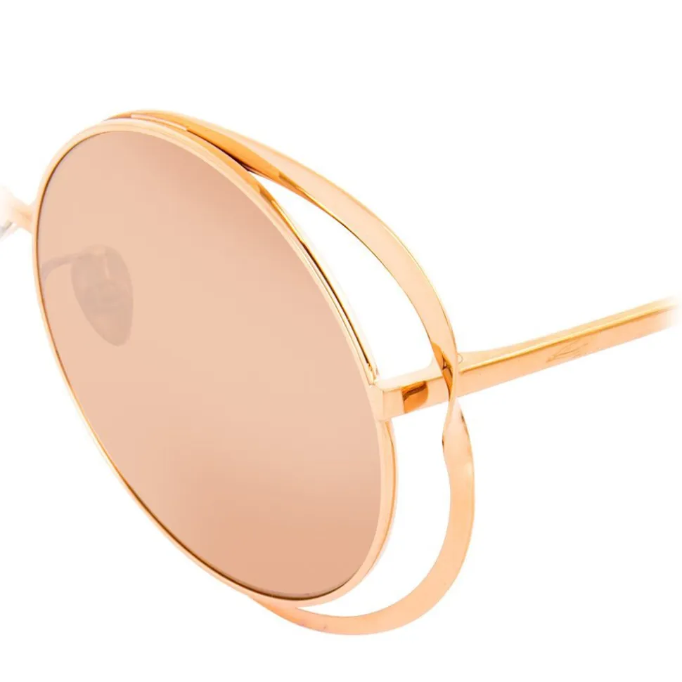 Embracing a world of vintage glamour, these round Linda Farrow sunglasses are crafted entirely from 18 – 22 carat rose gold-plated titanium. Key to the Linda Farrow collection, these statement sunglasses features rose gold precious lenses with a delicate twisted ribbon which creates a hyper feminine silhouette that mirrors the frames and showcases superior craftsmanship.