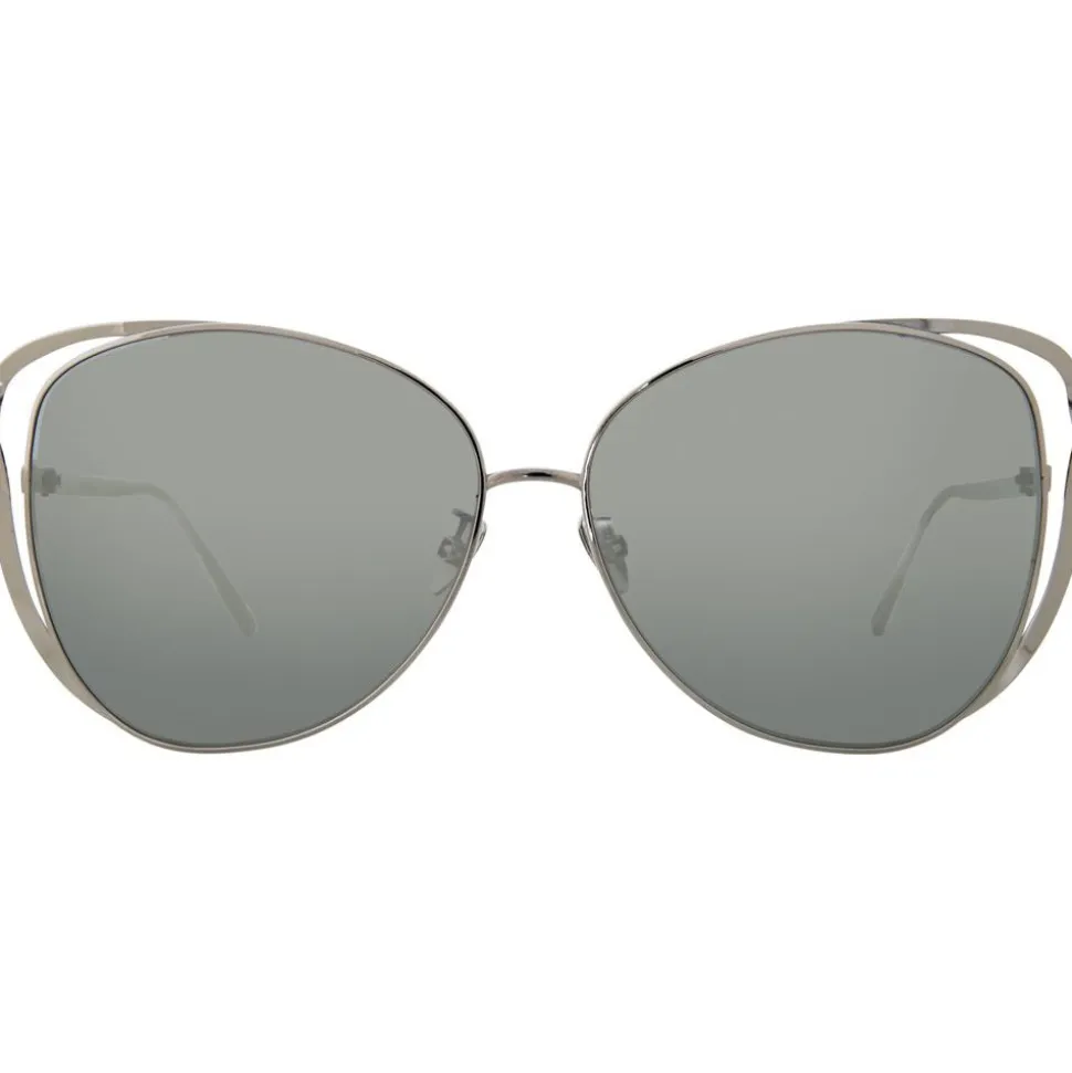 Championing the hallmarks of luxury and glamour, these cat eye ‘Rosarda’ sunglasses from Linda Farrow will instantly elevate your look. Crafted entirely from 18 – 22 carat white gold-plated titanium, these special sunglasses feature platinum precious lenses with a delicate twisted ribbon which creates a hyper feminine silhouette, mirroring the frames and showcasing superior craftsmanship.