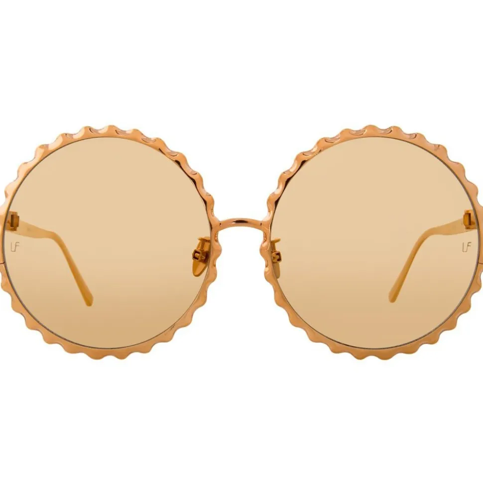 Channeling vintage silhouettes with whimsical details, these super statement sunglasses from Linda Farrow are created entirely from 18 – 22 carat rose gold-plated titanium, which is custom cast to create the special scalloped edges around the frame.