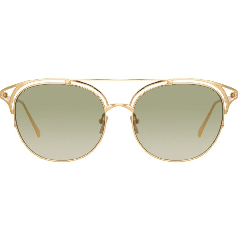 Drawing influence from the glamour of the jet set society captured by photographer Slim Aarons, these luxurious men’s Linda Farrow oval sunglasses are crafted entirely from 18-22 carat yellow gold-plated hypoallergenic lightweight titanium with co-ordinating green gradient nylon lenses and finished by hand.