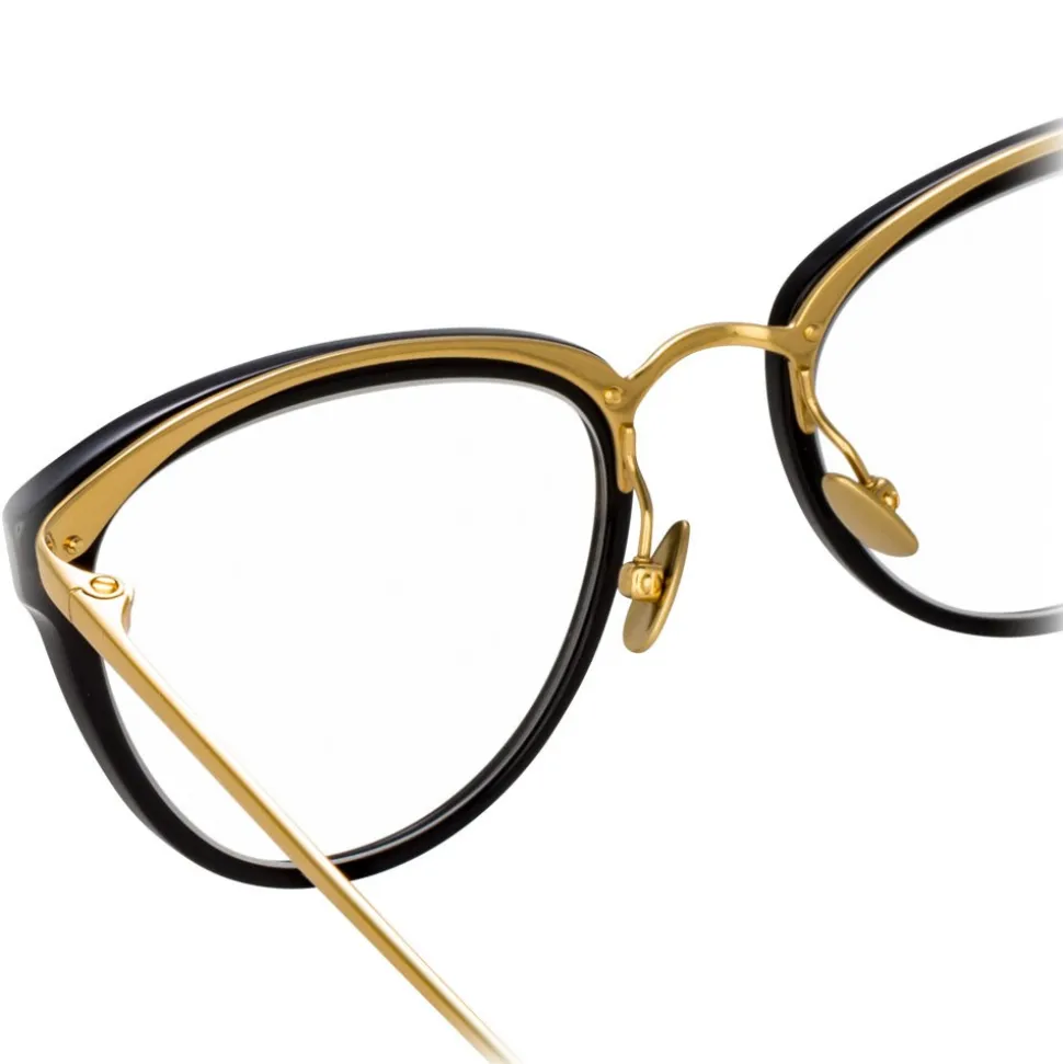 Encapsulating the vintage glamour of the jet set captured in Slim Aarons’ photographs, these winged cat-eye Linda Farrow optical glasses are the epitome of retro-luxe styling. 18 – 22 carat yellow gold-plated lightweight titanium runs along the back of the black Italian acetate frame and into the nose bridge and temples for a sophisticated contrast. Signature raised pins, tapered temples detailed with the Linda Farrow logo and adjustable nose pads for added comfort complete these glasses.