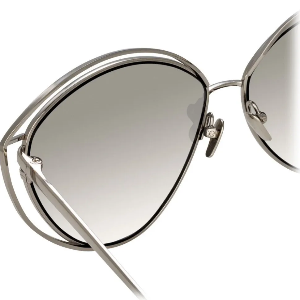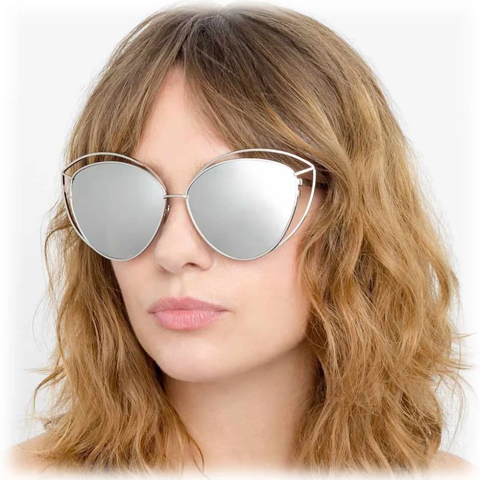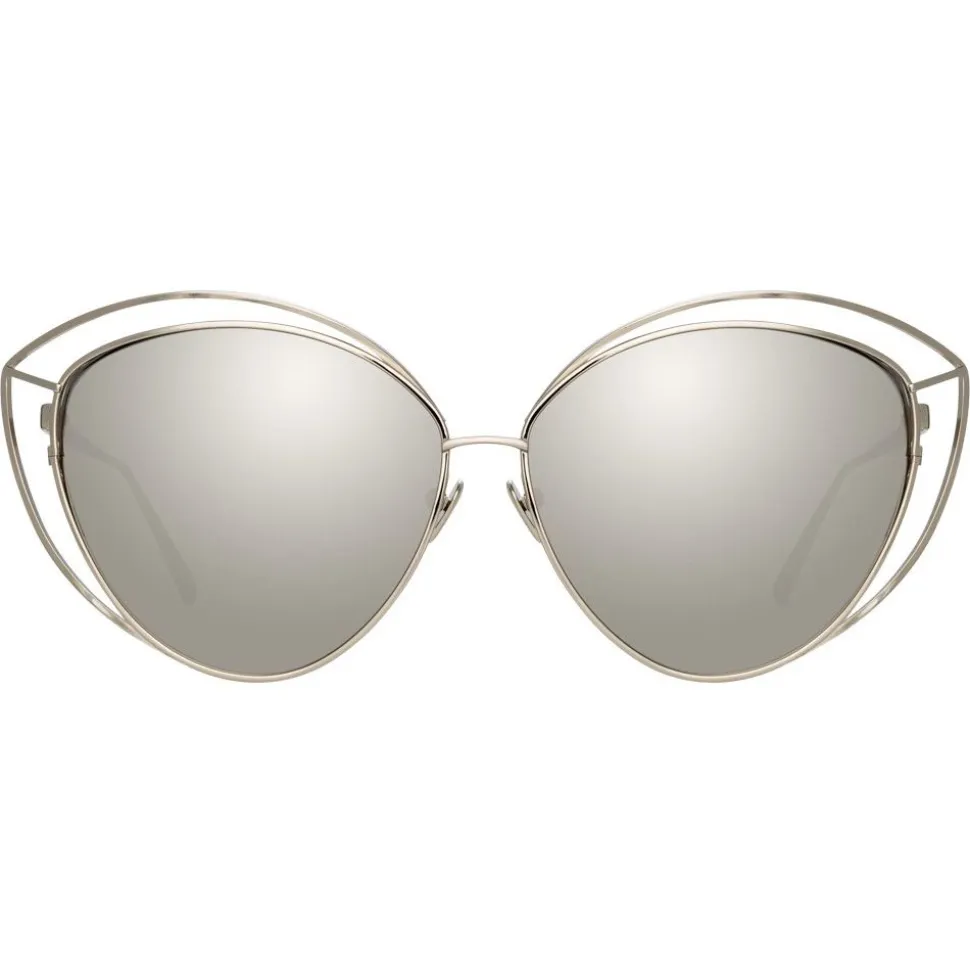 In a glamorous, oversized cat eye silhouette, these luxurious Linda Farrow sunglasses are crafted entirely from 18-22 carat white gold-plated hypoallergenic lightweight titanium with precious platinum lenses.