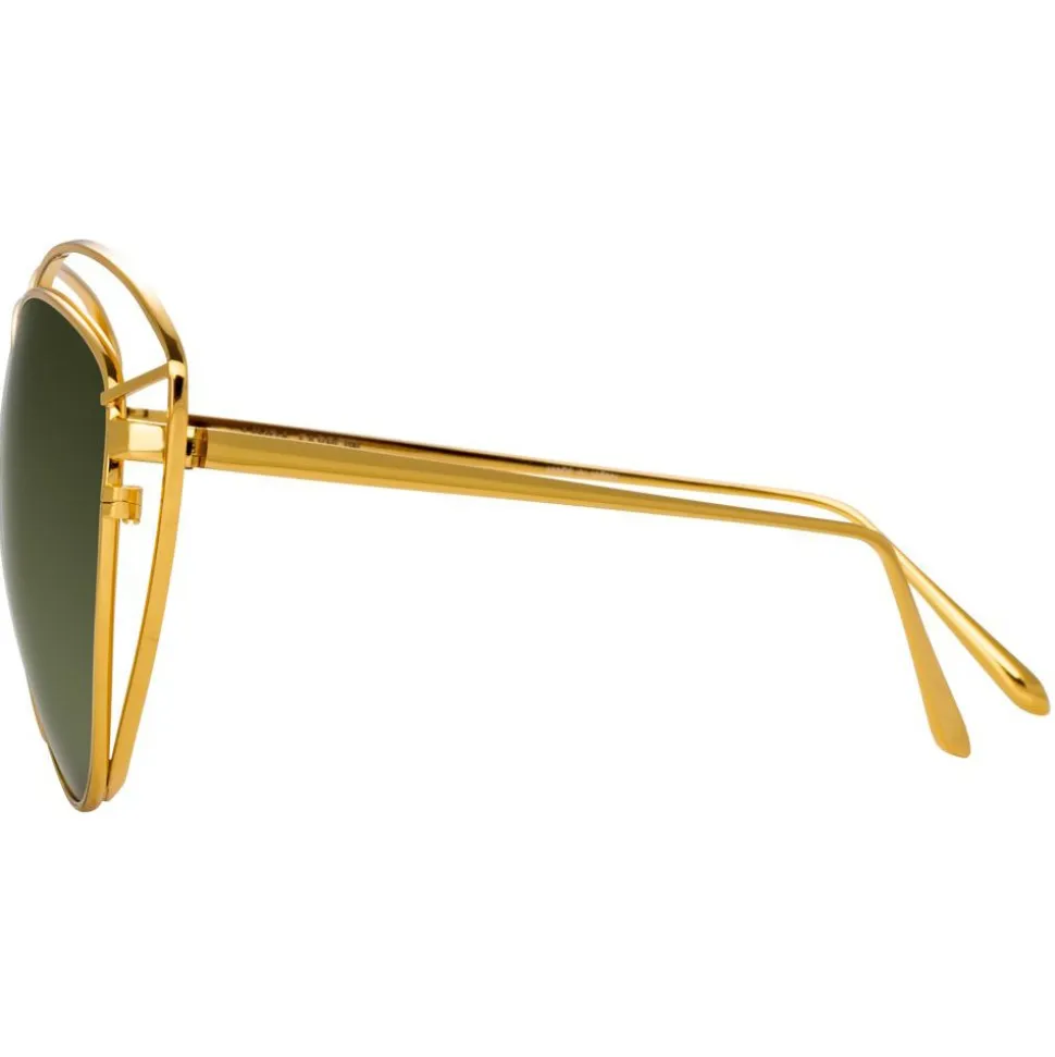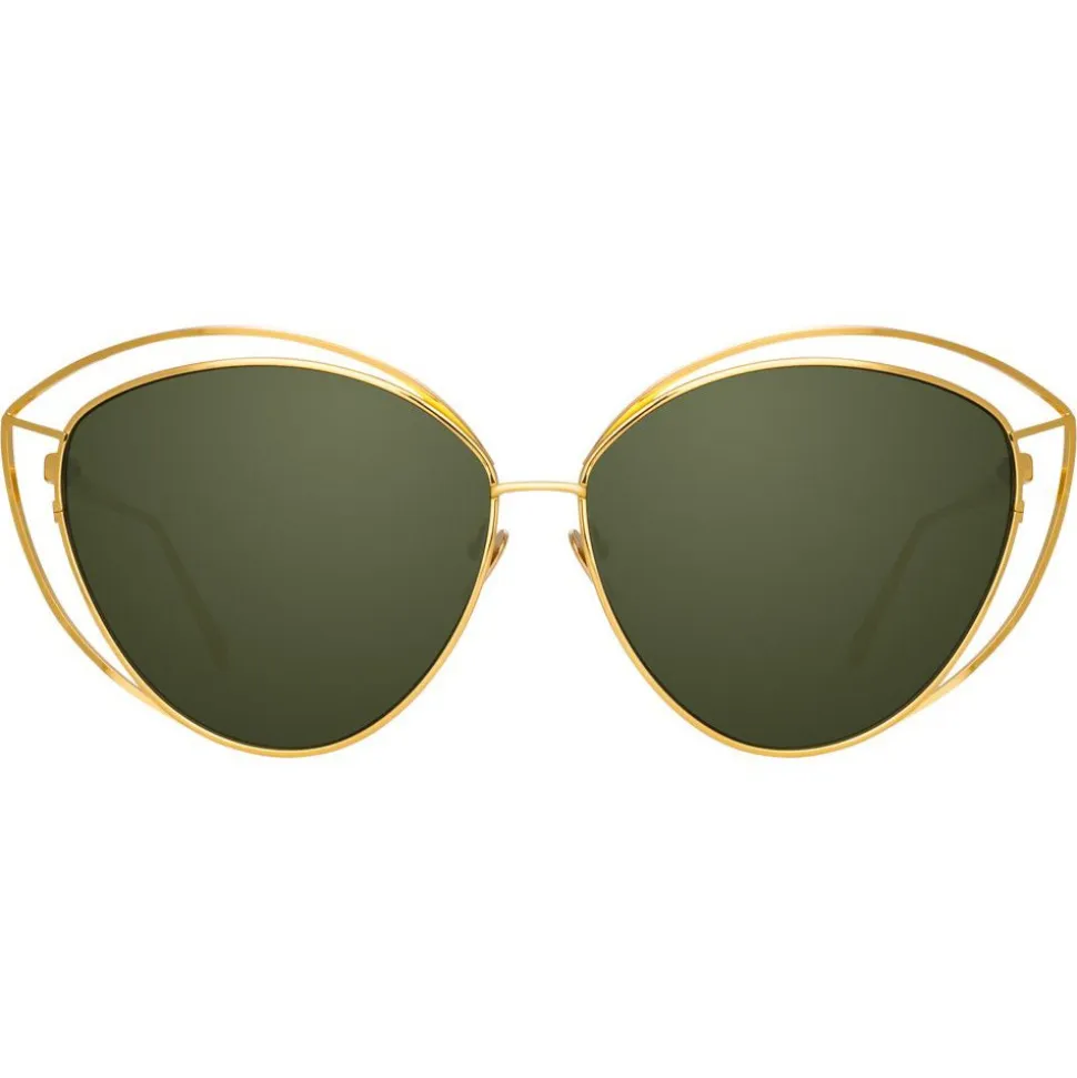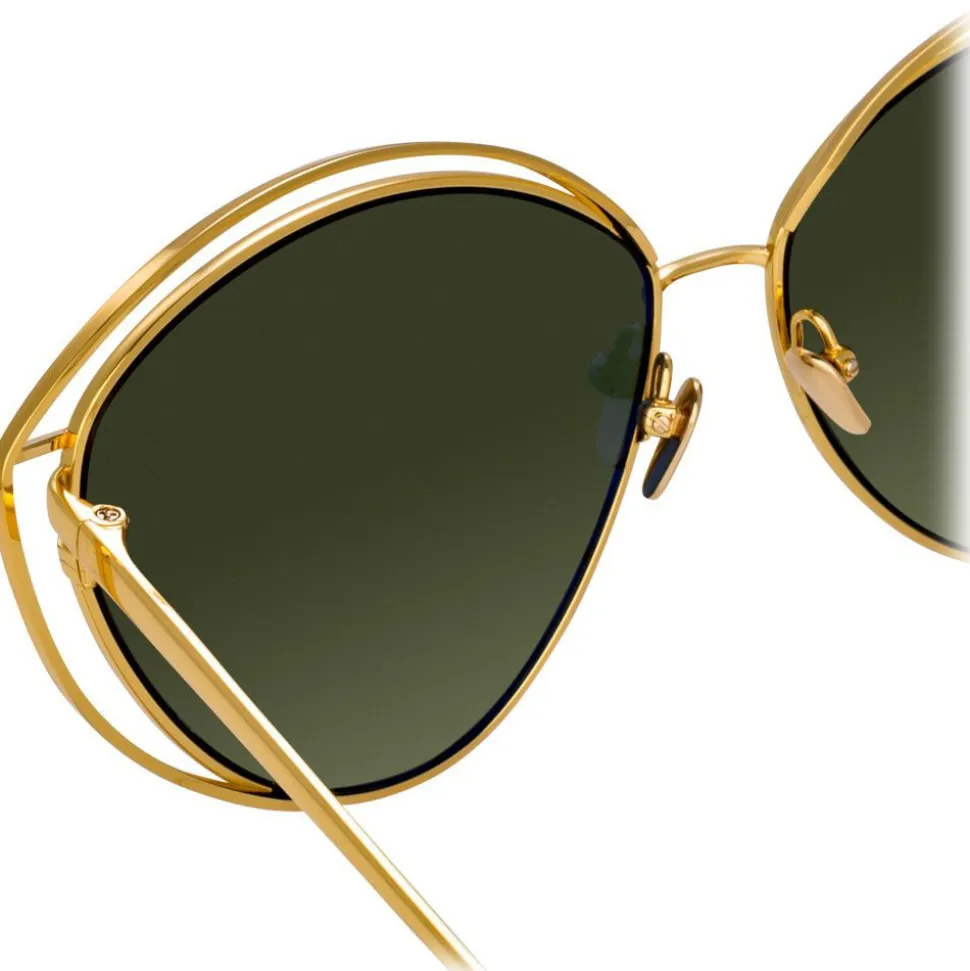 In a glamorous, oversized cat eye silhouette, these luxurious Linda Farrow sunglasses are crafted entirely from 18-22 carat yellow gold-plated hypoallergenic lightweight titanium with dark grey nylon lenses.