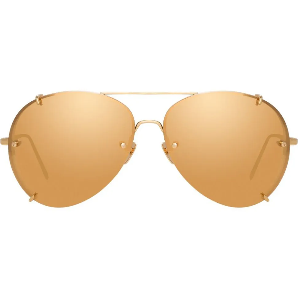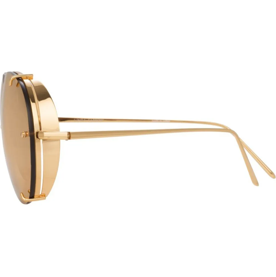 Inspired by the era of the glamorous jet set captured by Slim Aarons, these luxurious men’s Linda Farrow aviator sunglasses are crafted entirely from 18-22 carat yellow gold-plated hypoallergenic lightweight titanium. With co-ordinating thick precious yellow gold lenses, they feature statement side shields attached with clips and a flat top bar.