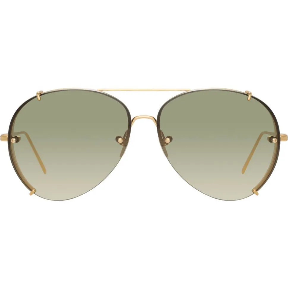 Inspired by the era of the glamorous jet set captured by Slim Aarons, these luxurious men’s Linda Farrow aviator sunglasses are crafted entirely from 18-22 carat yellow gold-plated hypoallergenic lightweight titanium. With contrasting green gradient nylon lenses, they feature statement side shields attached with clips and a flat top bar.