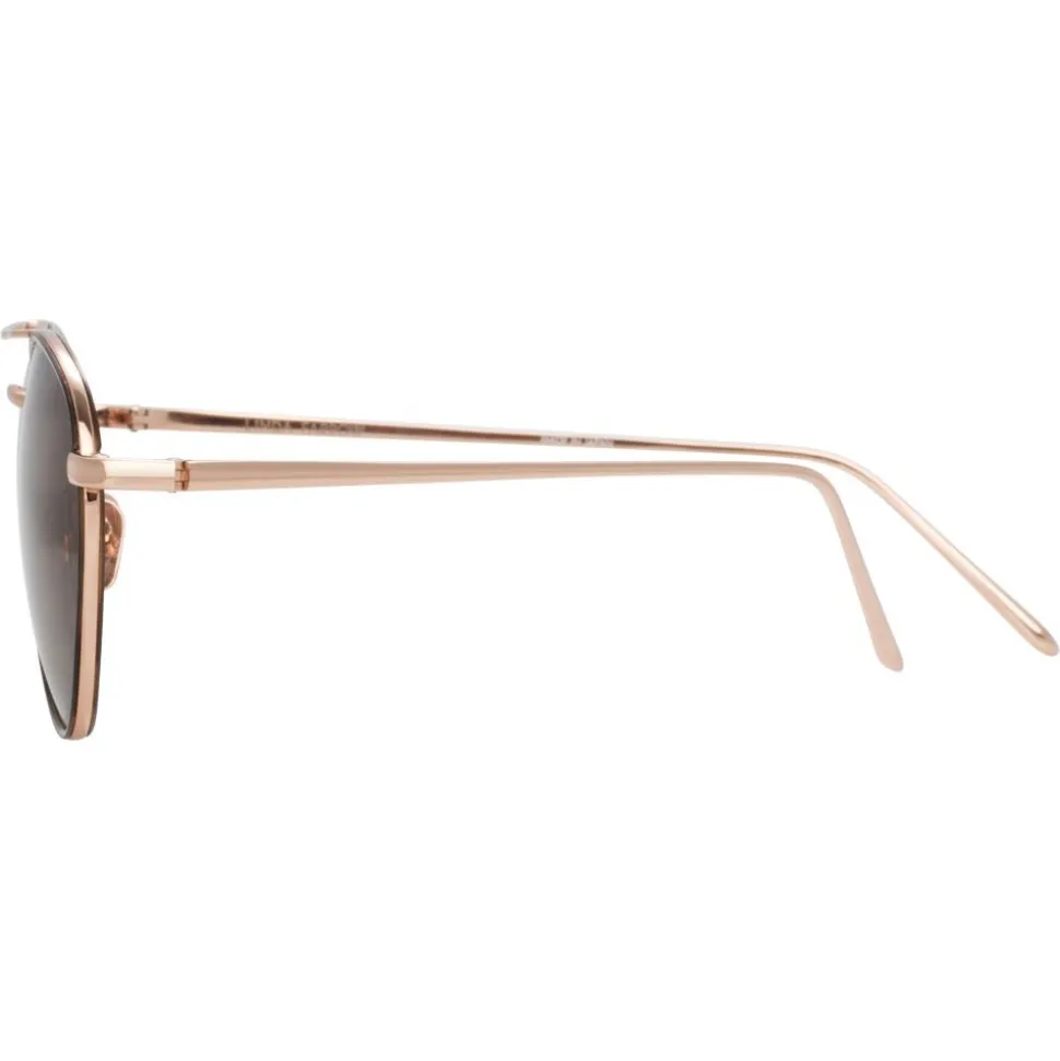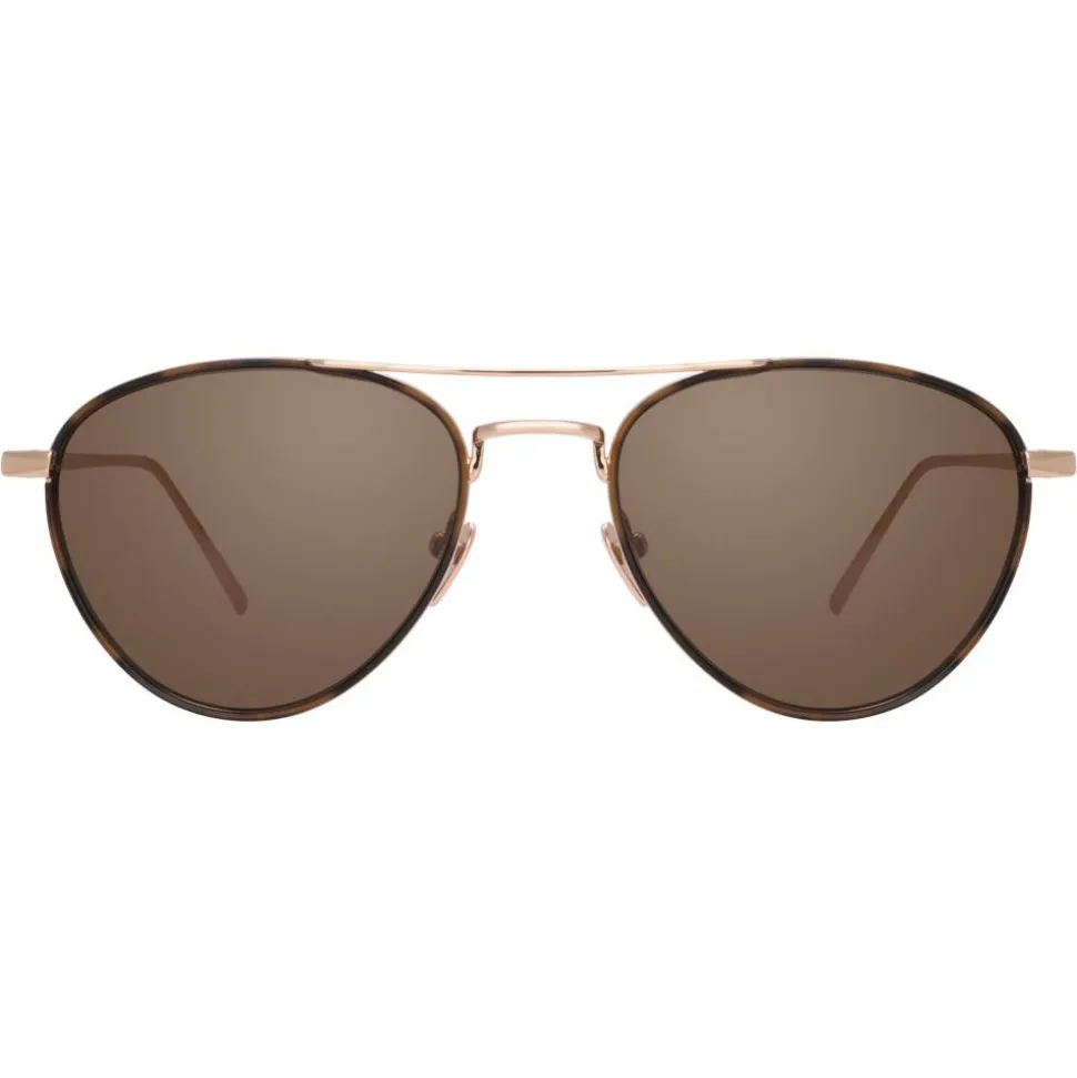 In an oval aviator silhouette, these luxurious men’s Linda Farrow aviator sunglasses take inspiration from the high life of the jet set captured by Slim Aarons. Crafted from 18-22 carat yellow gold-plated hypoallergenic lightweight titanium, they feature tortoiseshell Italian acetate inner windsor rims which hug the contrasting dark brown nylon lenses and a feature top bar.