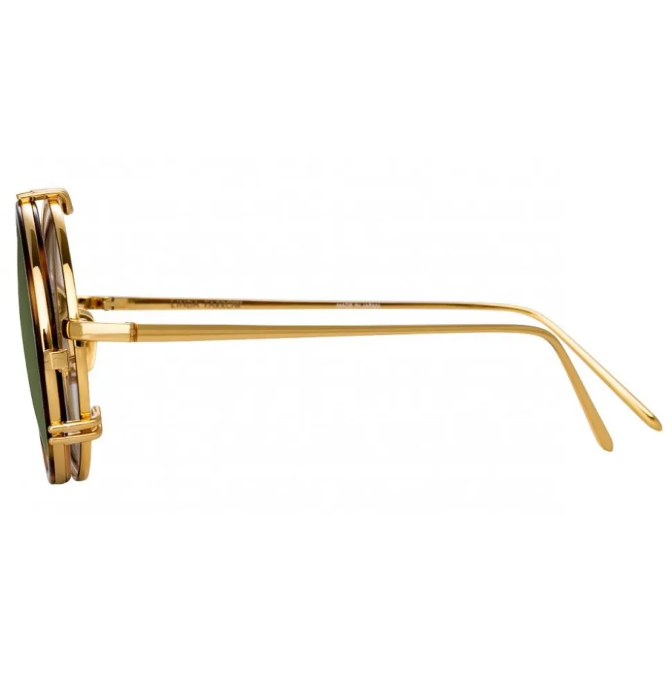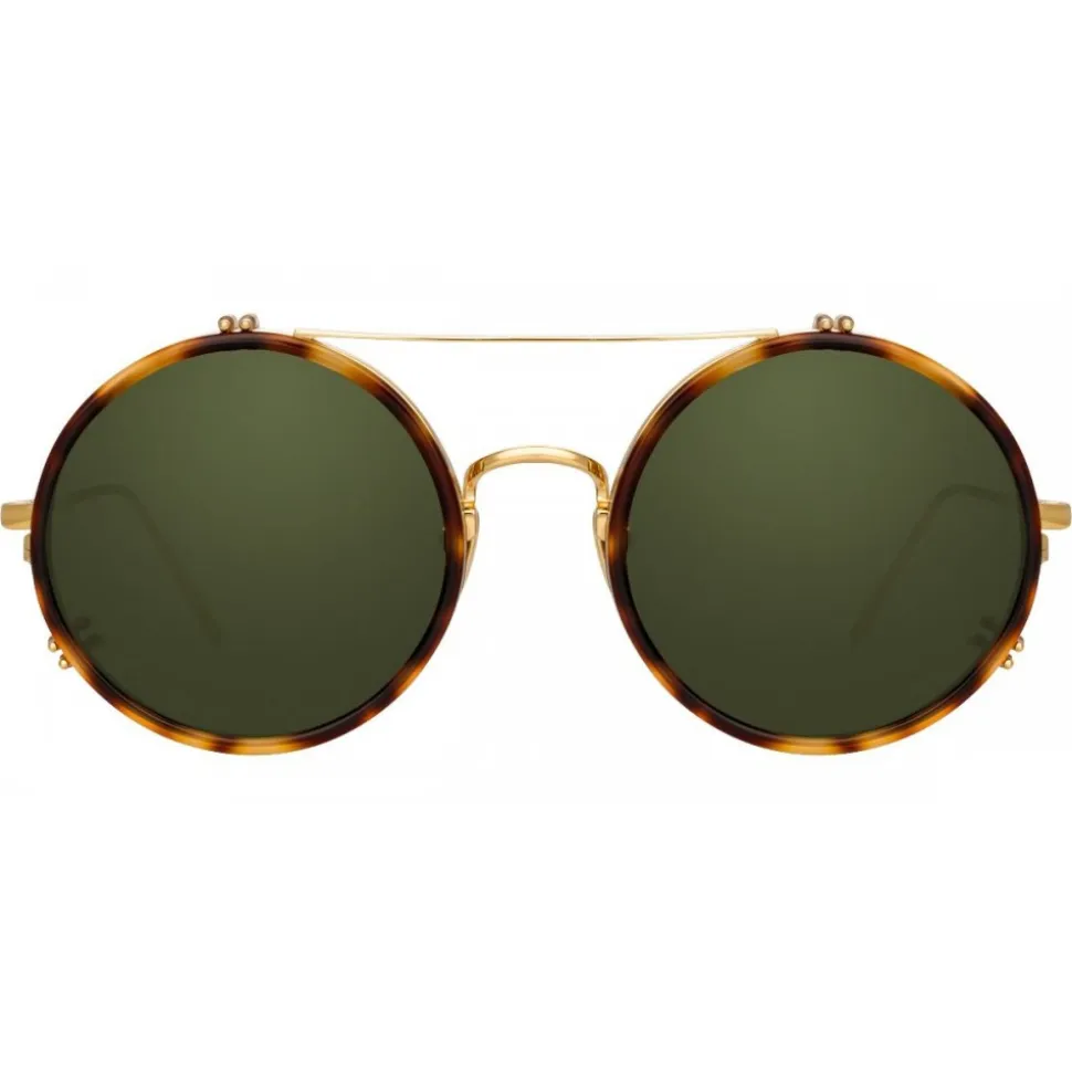 In a retro-inspired round silhouette, this luxurious Linda Farrow design brings together optical glasses crafted from 18-22 carat yellow gold-plated hypoallergenic titanium with an innovative tortoiseshell Italian acetate clip-on sunglasses feature, enabling prescription wearers to wear Linda Farrow sunglasses.