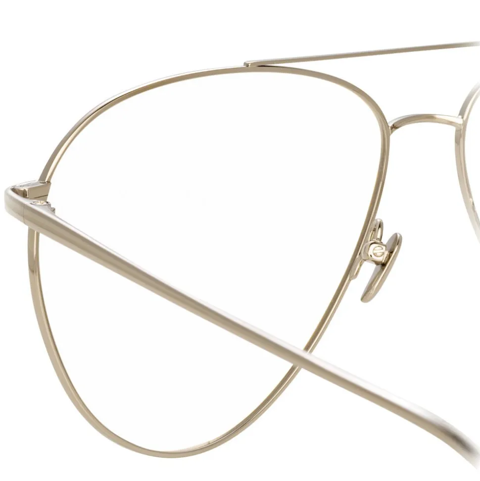 Elevating the aviator silhouette with unexpected details, these unisex Linda Farrow optical glasses are handcrafted from 18-22 carat yellow gold-plated hypoallergenic titanium. Accented with 18-22 carat white gold-plated hypoallergenic titanium to the rims, these optical glasses feature a raised curved nose bridge and flat top bar. Signature finishes include tapered temples complete with the Linda Farrow logo and adjustable nose pads for superior comfort.