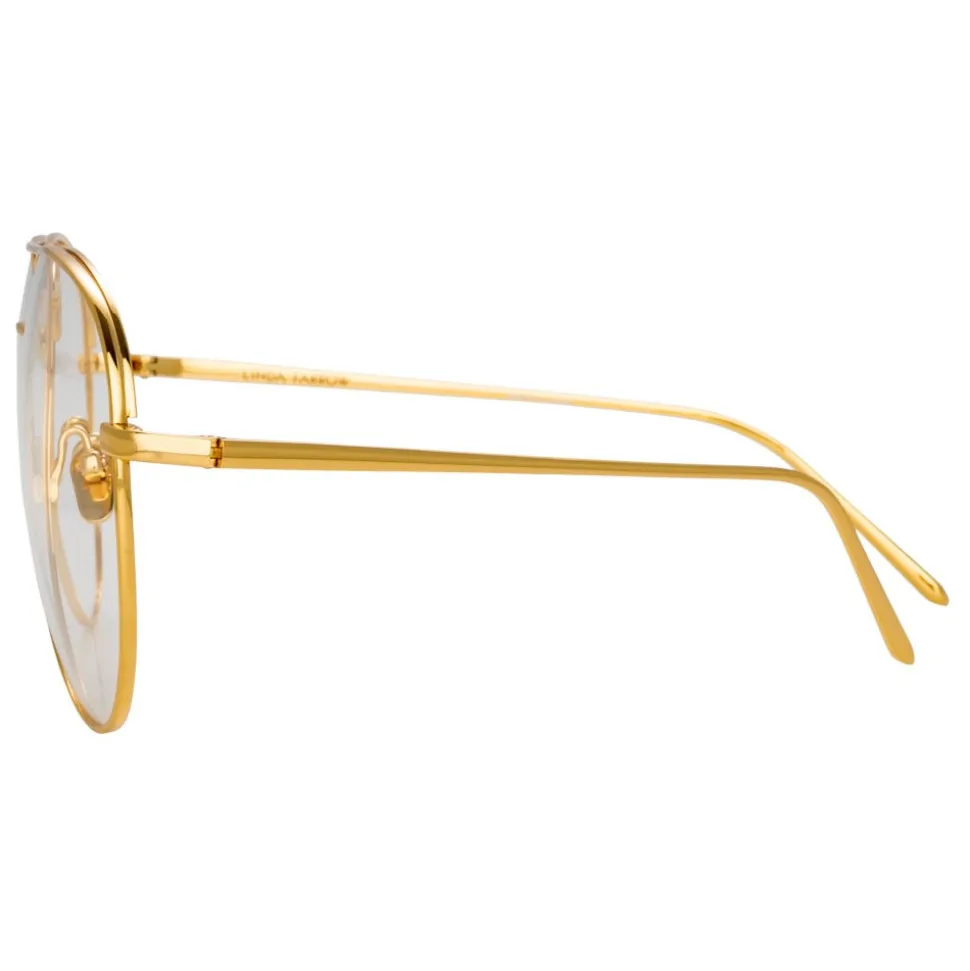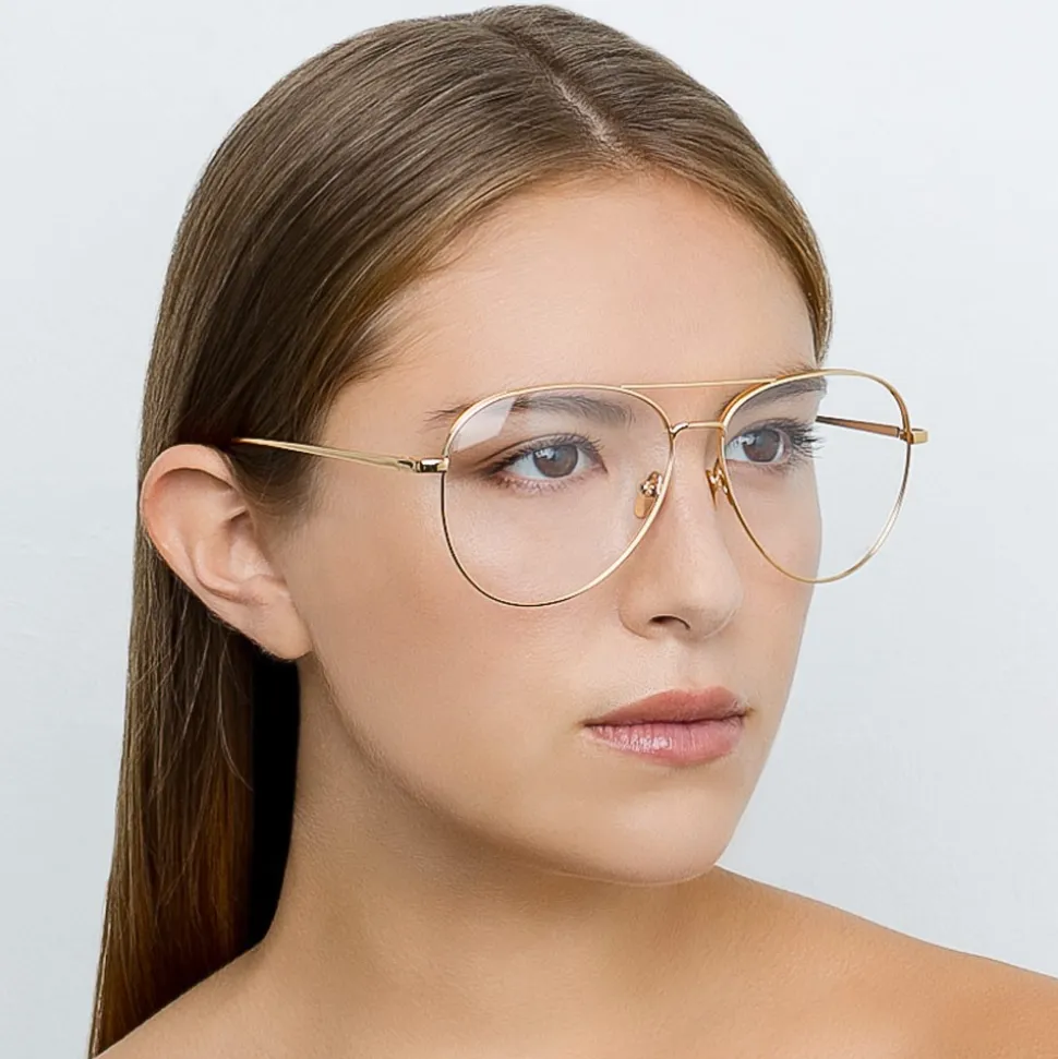 Reimagining the classic aviator silhouette in pure 18-22 carat yellow gold-plated hypoallergenic titanium, these luxurious unisex Linda Farrow optical glasses imbue timeless elegance. Finished by hand, they feature a double nose bridge and slim, lightweight temples finished with the Linda Farrow logo, tapered for superior fit. Adjustable nose pads provide superior comfort.