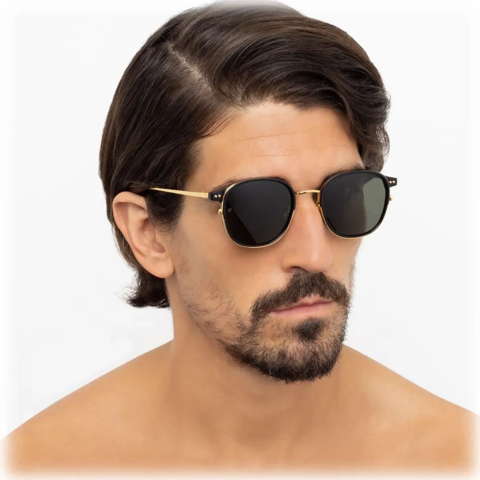 Bringing a classic shape with luxurious details, these men’s Linda Farrow sunglasses are crafted from yellow gold-plated ultra lightweight titanium and black Italian acetate. The inner Windsor rim profiles the solid grey lenses, accentuated with a coordinating lip which creates an eye-catching juxtaposition with the yellow gold rim.