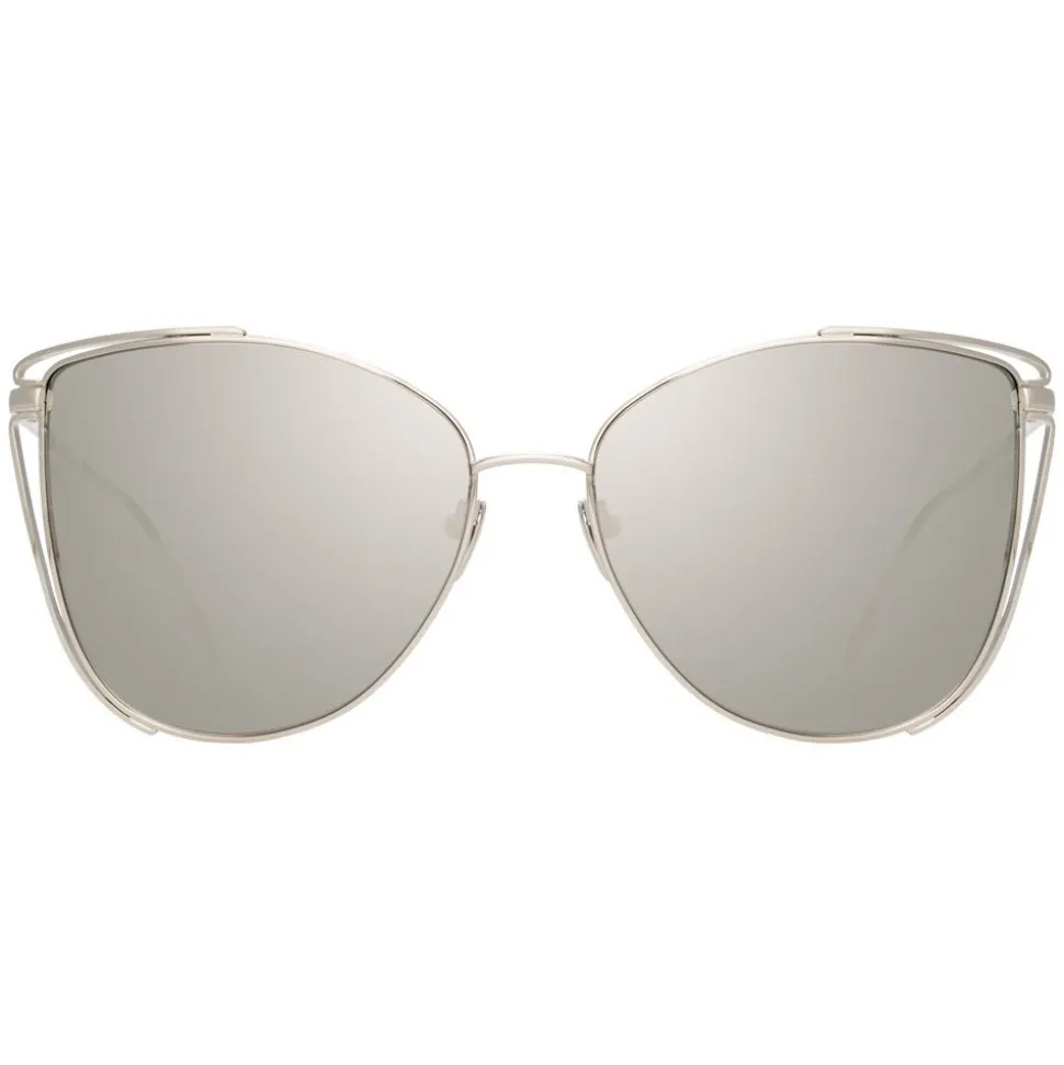 Bringing the glamour to a classic silhouette, these oversized Linda Farrow sunglasses take the cat eye to the next level. The corners of the white gold-plated titanium frames are mirrored to give their clean aesthetic a touch of the unexpected. Paired with luxurious platinum lenses, they transport you to a place of exotic beauty.