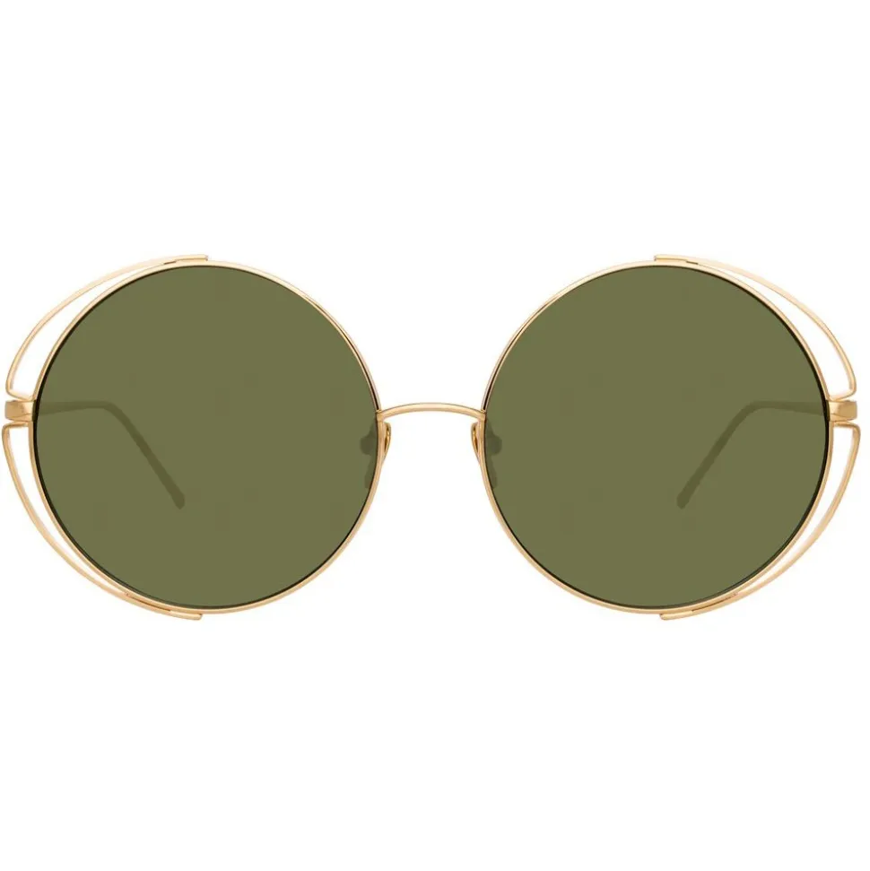 A key silhouette for the season and beyond, these oversized round Linda Farrow sunglasses bring a touch of the unexpected. Crafted entirely from yellow gold-plated titanium with contrasting deep green lenses for an effortlessly chic look, the frames are outlined at the corners, creating an eye-catching illusion of negative space.