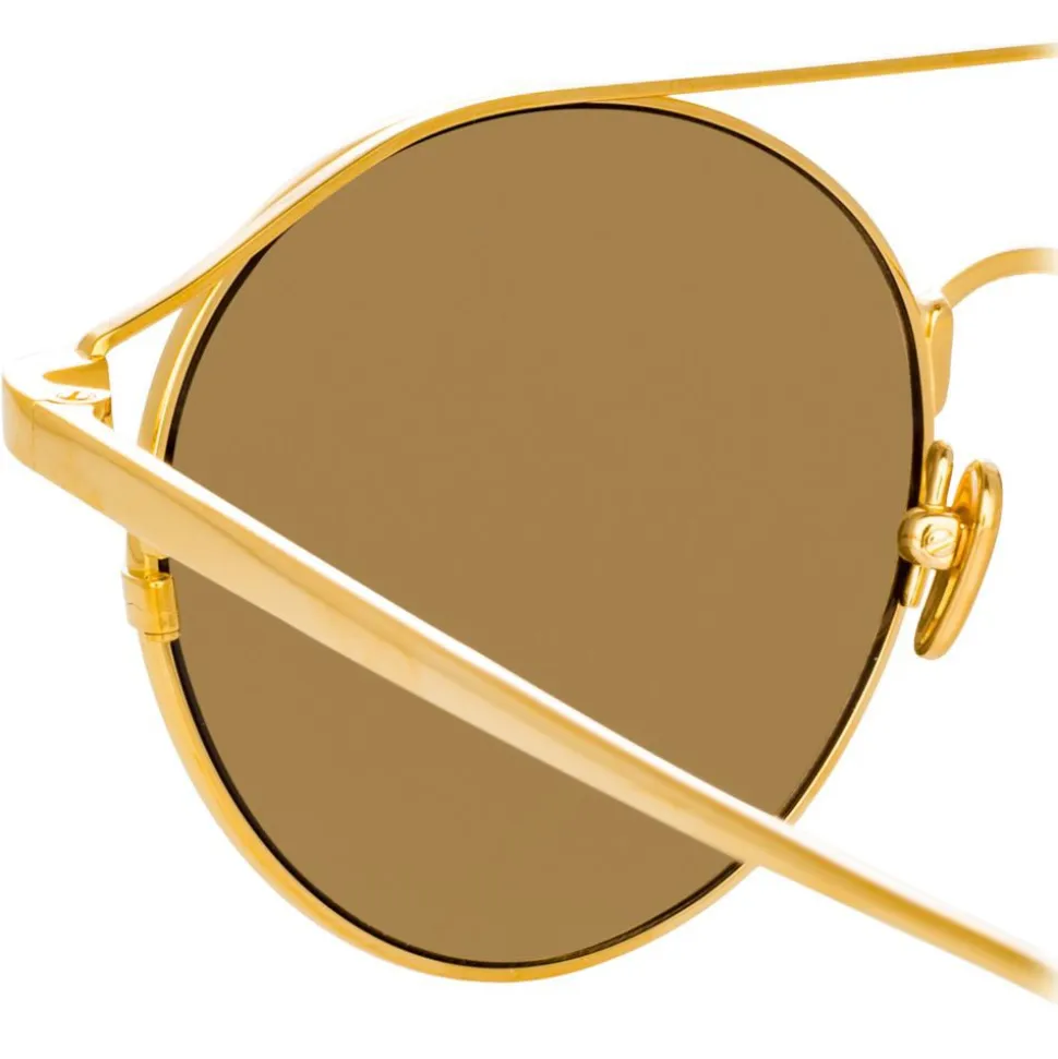 The new classic, these unisex round aviator sunglasses are crafted entirely from yellow gold-plated ultra lightweight titanium. For a touch of unexpected luxe, the top bar of the frame extends out at the corners to create the illusion of negative space between the precious yellow gold lenses.