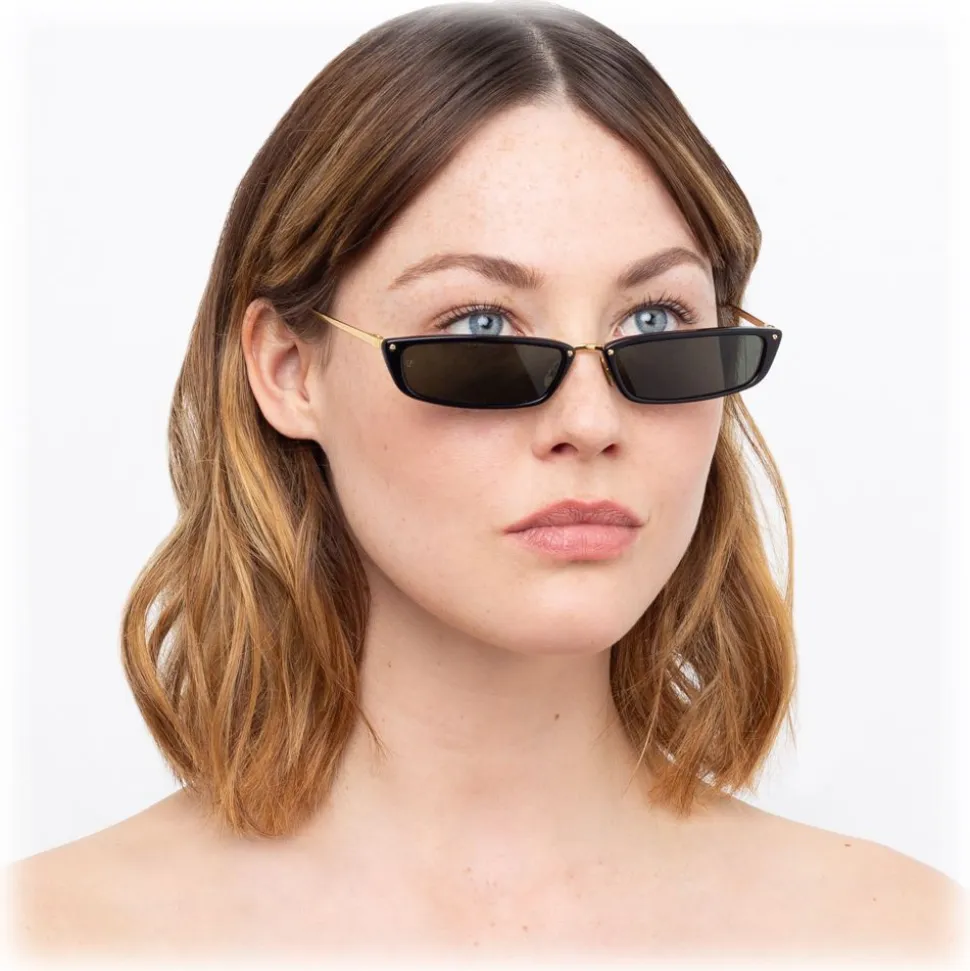 The silhouette for the season, these super skinny 838 Linda Farrow sunglasses pair rich, high shine black Italian acetate with ultra streamlined yellow gold-plated titanium, running across the back of the frame and through the temples. A hero from our campaign, and a hero for your collection.