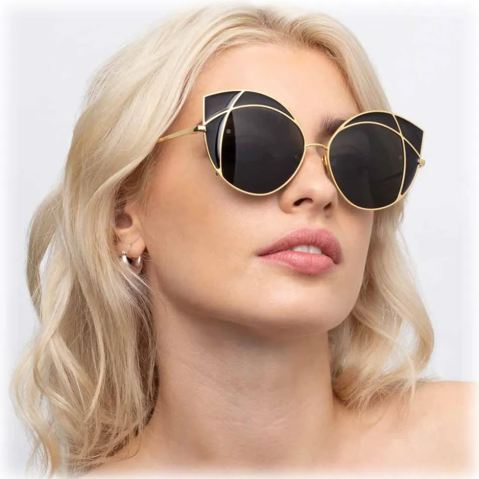 A fusion of vivid, warm hues and rich textures inspired by oriental cities, these winged cat eye Linda Farrow sunglasses pair yellow gold-plated titanium frames with dark grey lenses. The corners are accented with translucent black ‘stained glass’, evoking a feeling of understated luxury.