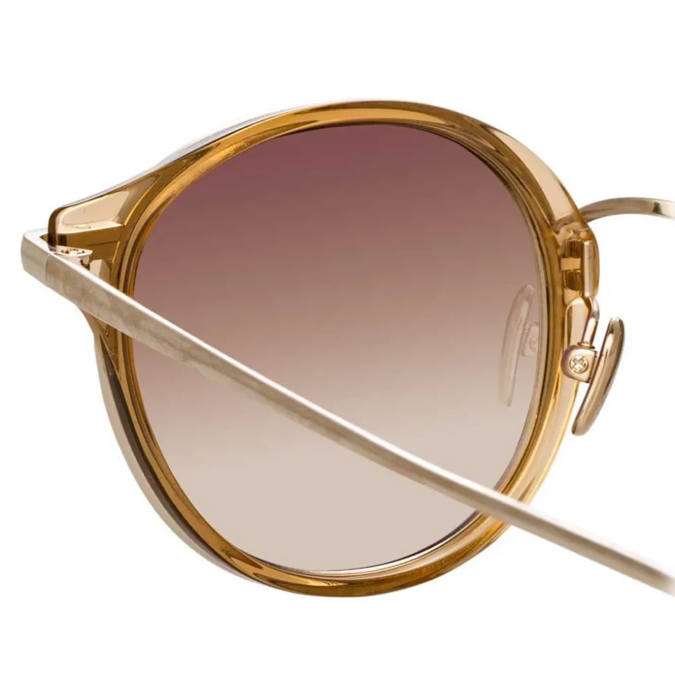 Elevating the classic D-Frame silhouette with luxurious details that take inspiration from the warm tones and rich textures of the Orient, these unisex Linda Farrow sunglasses pair tobacco brown Italian acetate with 18-22 carat light gold-plated titanium, which appears ‘trapped’ inside the frame. Complete with brown gradient lenses, these super lightweight, detail-oriented yet understated sunglasses will elevate the everyday.