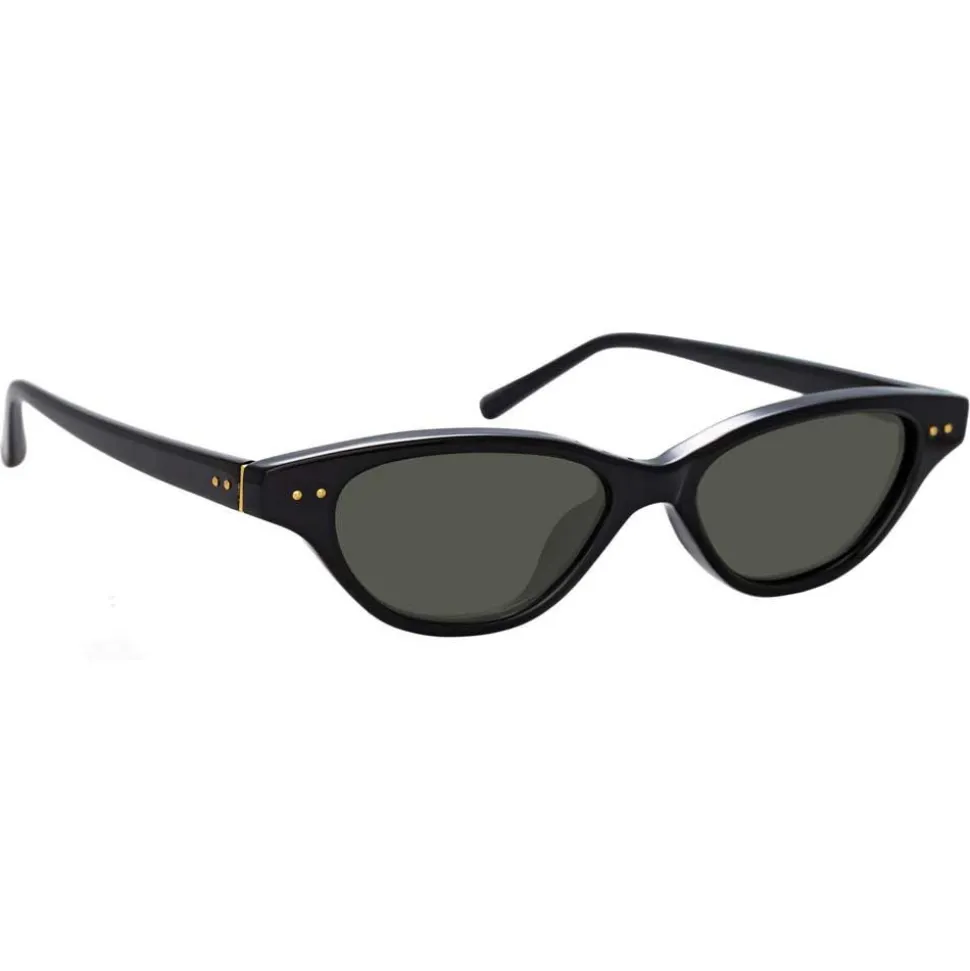 Designed in collaboration with Alessandra Ambrosio, these skinny cat eye sunglasses bring glamorous yet contemporary appeal. Black Italian acetate frames are paired with dark grey lenses which harness new Zeiss Pure technology for a flawless lens with scratch-free innovation and twice the durability. Signature raised pins in yellow gold complete this standout Linda Farrow style.