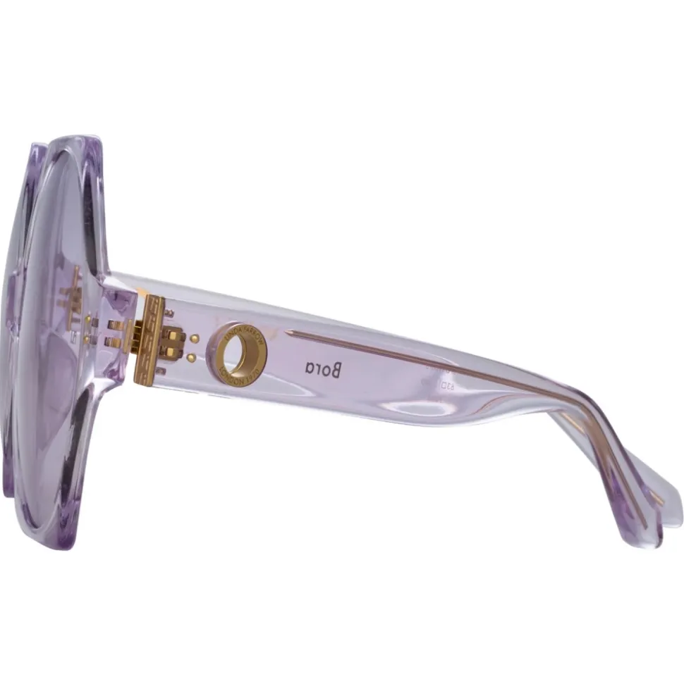 The Bora sunglasses from the LINDA FARROW collection are careful balance of size and weight. The round lenses allow the frame to be oversized without becoming heavy and are juxtaposed with a fine angular acetate frame. Hewn from translucent lavender acetate the style carries sculpted nose pads and temple tips for comfort.