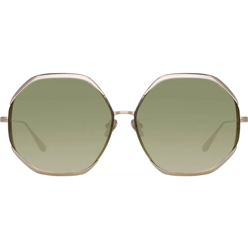 Sculpted titanium is molded around a hexagonal lens to form these opulent LINDA FARROW sunglasses. Channelling a 70s spirit the 22 carat light gold Camila frame has cut away detailing to reveal exposed lens edges. Our graduated temple sweeps from hinge to tip leading to a rounded end which provides comfort to the wearer. The style is fitted with green graduated nylon lenses which offer anti-glare and complete UV protection. Complete with adjustable nose pads for a tailored fit.