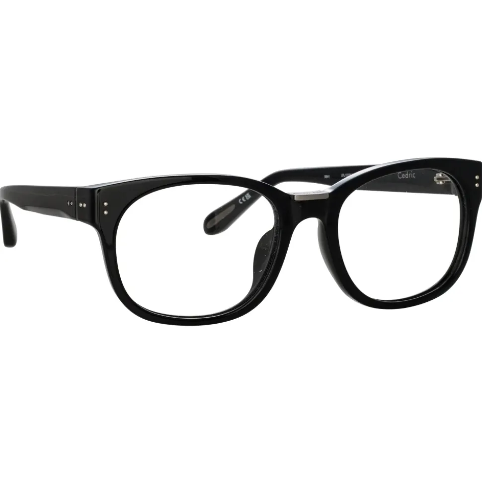 Rooted in a signature design language of the brand the Cedric optical frames combine glossy acetate and sleek titanium for an elevated style. Crafted from black acetate the beveled acetate temples transition into sculpted tips finished with inset matt nickel colour plating highlights.