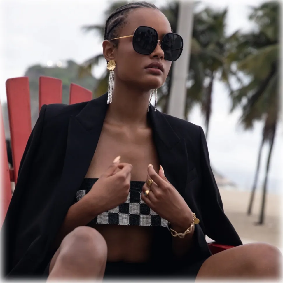 Introducing the Celia, the Oversized silhouette of the A/W ’23 season. Finely sculpted translucent black acetate rims are mounted onto a yellow gold plated titanium frame work which runs along the inner brow and transitions to sleek tapered temples.