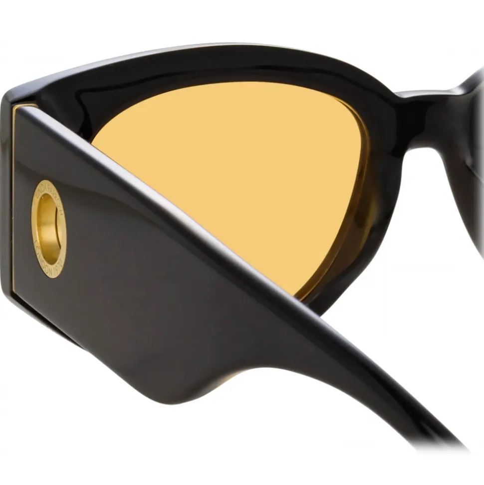 Statement orange lenses offer a new perspective to the LINDA FARROW Debbie sunglasses. Formed from recycled black acetate the rounded D-frame style is hand polished for a high gloss finish. Set into the temple our signature 22 carat gold plated logo eyelets are engraved with ‘London 1970’ to mark the founding of the brand. Sculpted nose pads and temple tips ensure a comfortable fit.