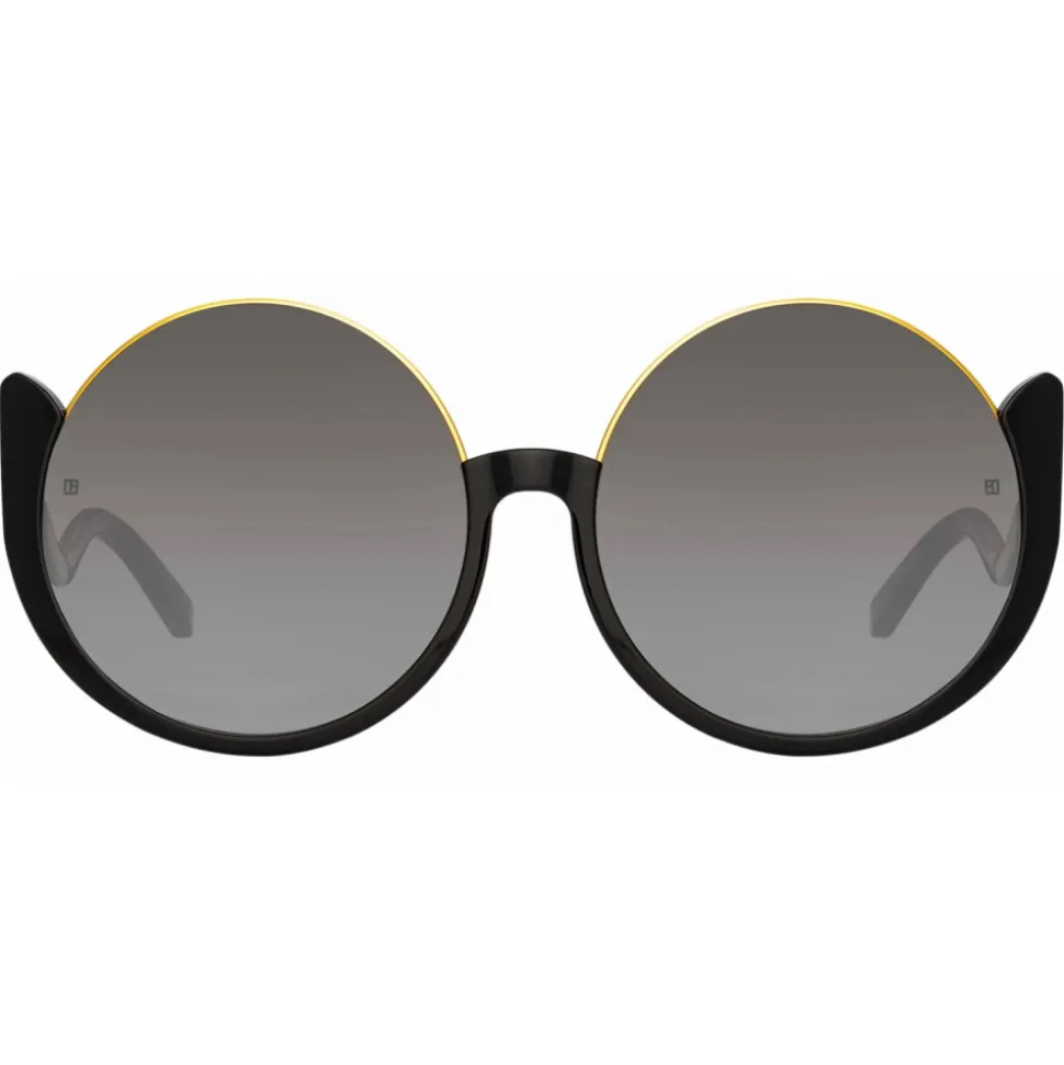 The oversized round lenses of the Florence sunglasses are delicately outlined with a 22 carat yellow gold plated titanium rim, contrasted with a recycled black acetate frame sweeping below the eye. The style captures the spirit of LINDA FARROW as the frame flows into playful wavy temples. Fitted with grey graduated nylon lenses which offer anti-glare and 100% UV protection. Sculpted nose pads and temple tips provide comfort to the wearer.