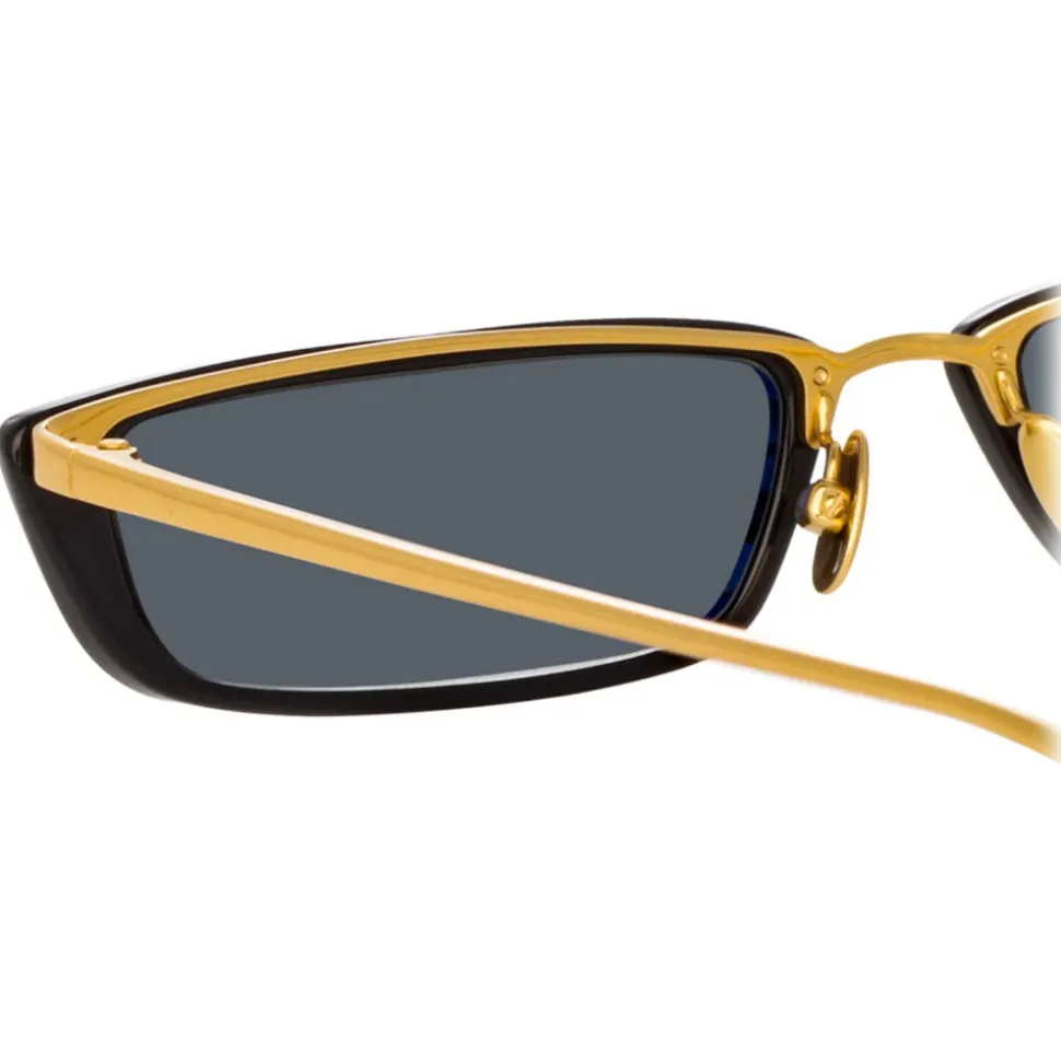 This modern skinny silhouette sunglasses from the LINDA FARROW collection follow a signature design language of the brand. The Issa pairs finely polished recycled black acetate rims with a 22 carat yellow gold plated titanium framework, which mirrors the inside of the frame and runs into sleek engineered temples. The style is fitted with solid grey lenses and competed with adjustable nose pads for superior comfort.