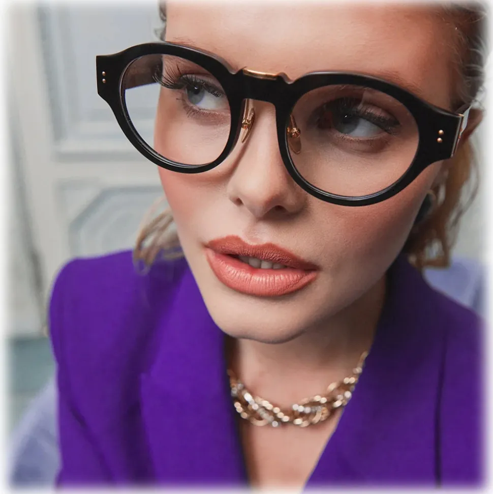 An exploration of angles and facets the Leon optical glasses are an elevated frame. This LINDA FARROW style is crafted from recycled black acetate and employs signature detailing at the bridge.