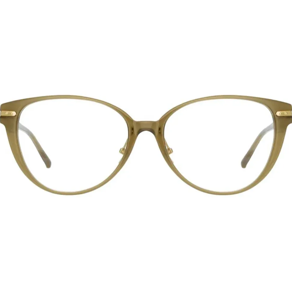 These cat eye optical glasses from the new Linda Farrow LINEAR collection are the epitome of a modern classic. Crafted from khaki Italian hand polished acetate and ultra lightweight 18-22 carat luna gold-plated titanium.