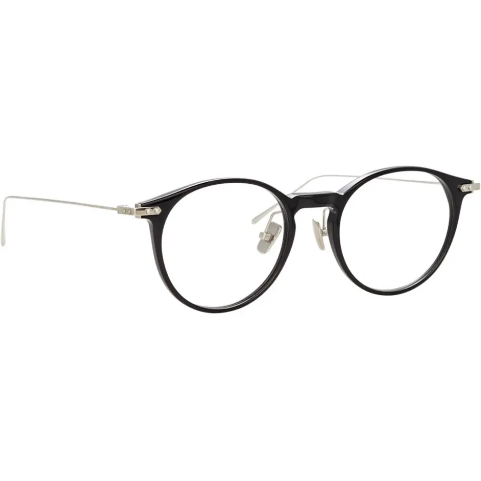 A timeless oval silhouette from the new Linda Farrow LINEAR collection, these unisex optical glasses pair black Italian acetate with ultra-thin 18-22 carat white gold-plated titanium. Engineered for unrivalled fit and comfort, innovative design details including white gold linear accents inset the frame, raised pins and a lasered logo complete this style for the ultimate in everyday luxury eyewear.