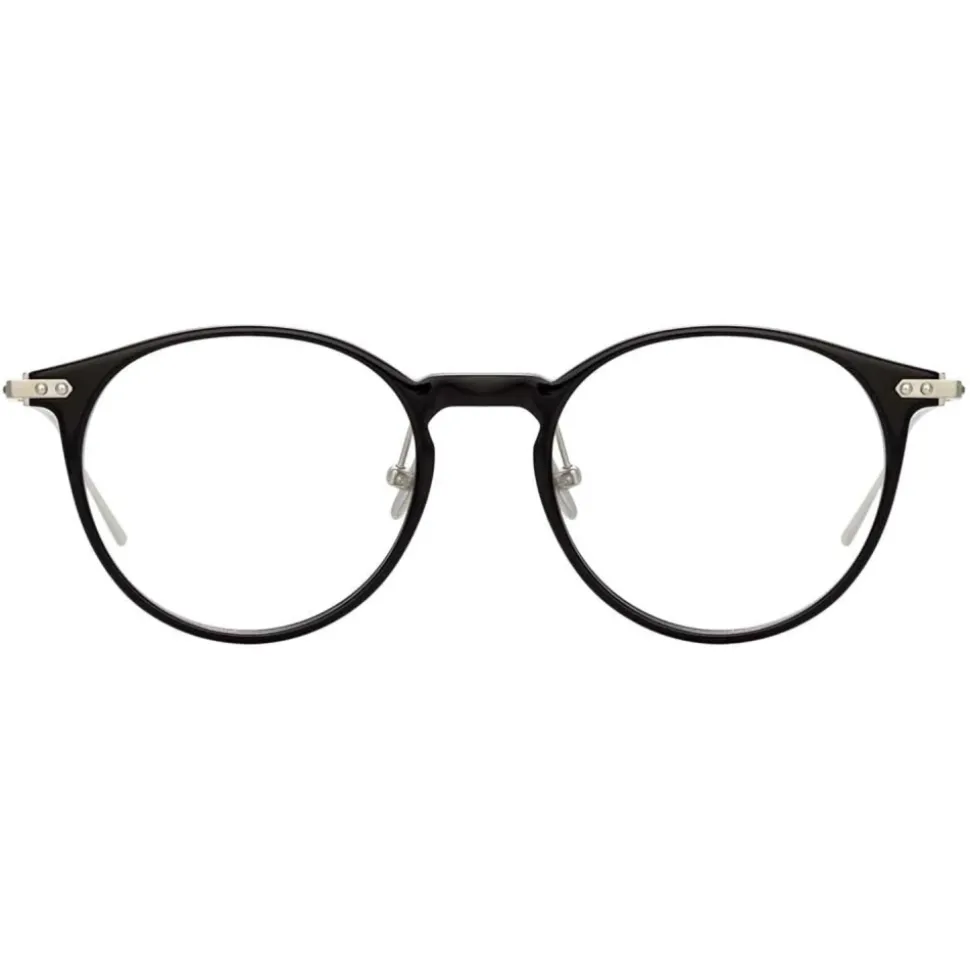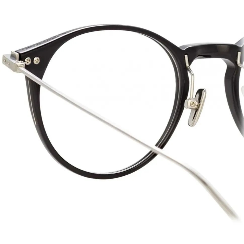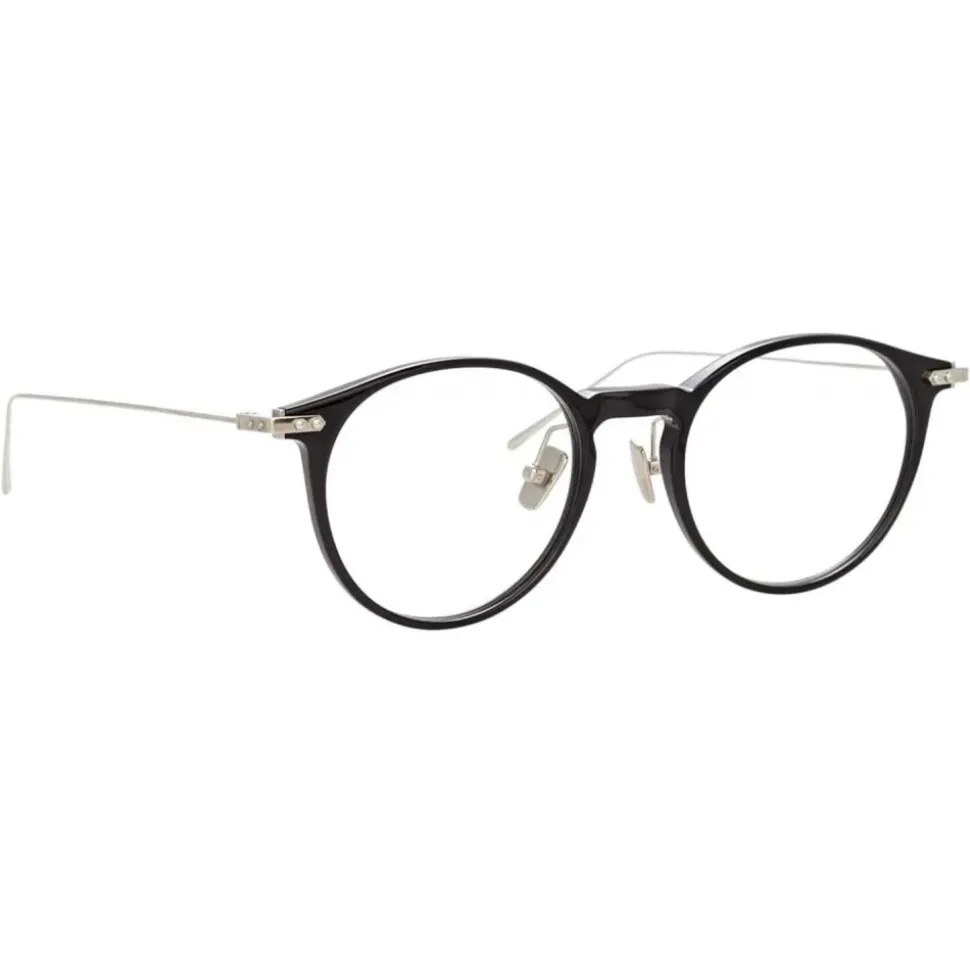 A timeless oval silhouette from the new Linda Farrow LINEAR collection, these unisex optical glasses pair black Italian acetate with ultra-thin 18-22 carat white gold-plated titanium. Engineered for unrivalled fit and comfort, innovative design details including white gold linear accents inset the frame, raised pins and a lasered logo complete this style for the ultimate in everyday luxury eyewear.