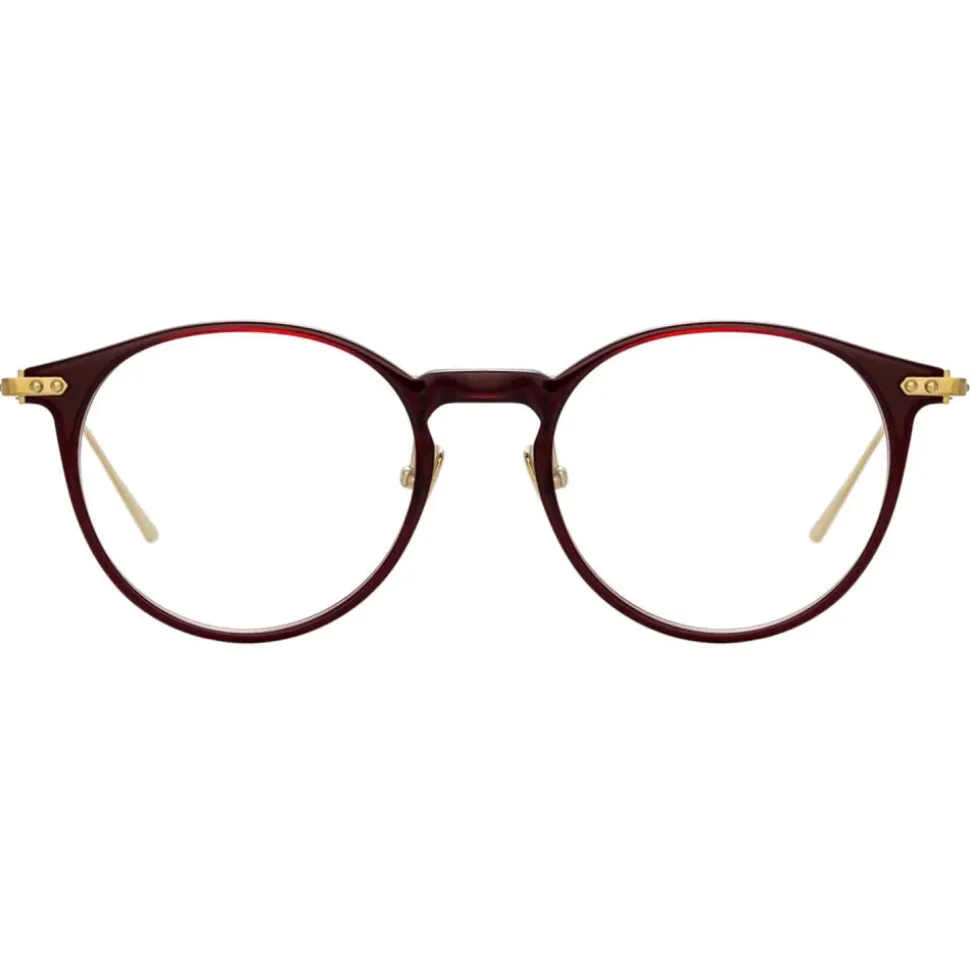 A timeless oval silhouette from the new Linda Farrow LINEAR collection, these unisex optical glasses pair burgundy Italian acetate with ultra-thin 18-22 carat light gold-plated titanium. Engineered for unrivalled fit and comfort, innovative design details including light gold linear accents inset the frame, raised pins and a lasered logo complete this style for the ultimate in everyday luxury eyewear.