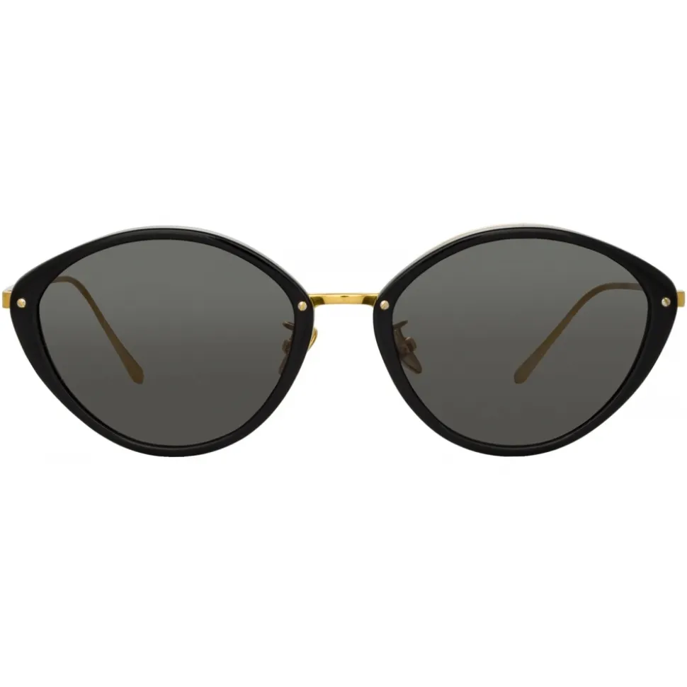 These delicate cat eye sunglasses from the LINDA FARROW collection employ a signature design language of the brand. Expertly polished recycled black acetate rims are paired with a 22 carat yellow gold plated exposed titanium frame work running along the inner brow of the style.