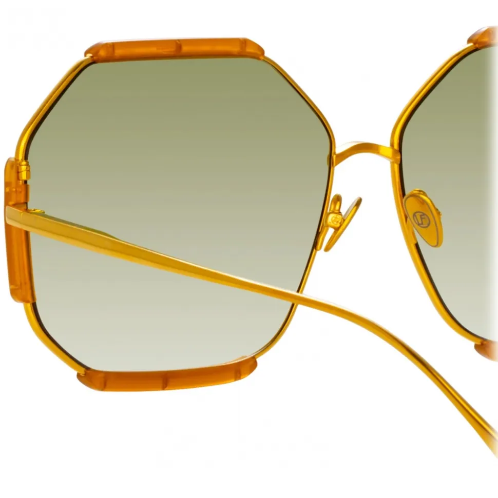 Reminiscent of 1970s playful allure these hexagon sunglasses channel a quintessential LINDA FARROW design language. A delicate 22 carat yellow gold plated titanium rim is accented with glossy honey acetate details.