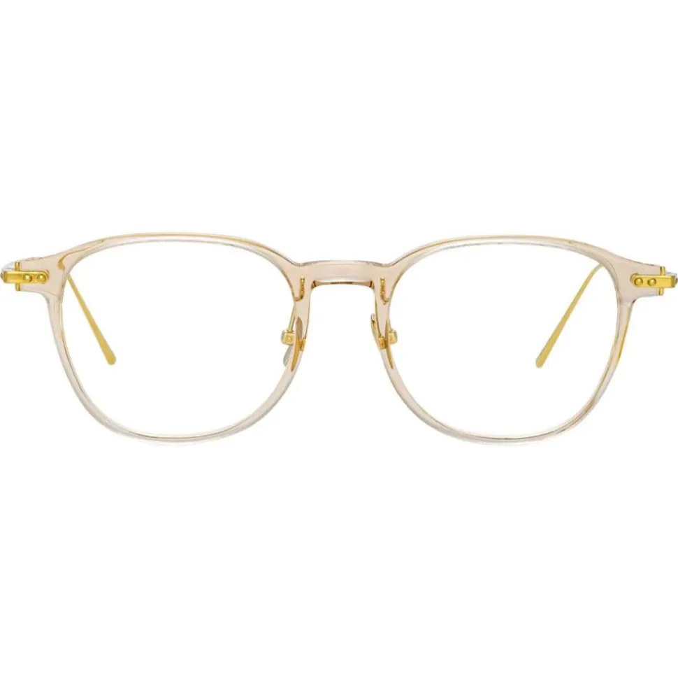 Finding inspiration in the clean lines of architecture these D-Frame eyeglasses from the LINDA FARROW Linear collection are an example of simplicity executed with precision. The ash acetate front, hand polished for a high shine, is engineered with custom titanium hinges which give way to sleek 22 carat luna gold plated temples. Titanium nose pads set into the acetate front can be adjusted for a tailored fit. This frame has been specifically designed with curved temples for an Asian fit. Also available in European fitting.