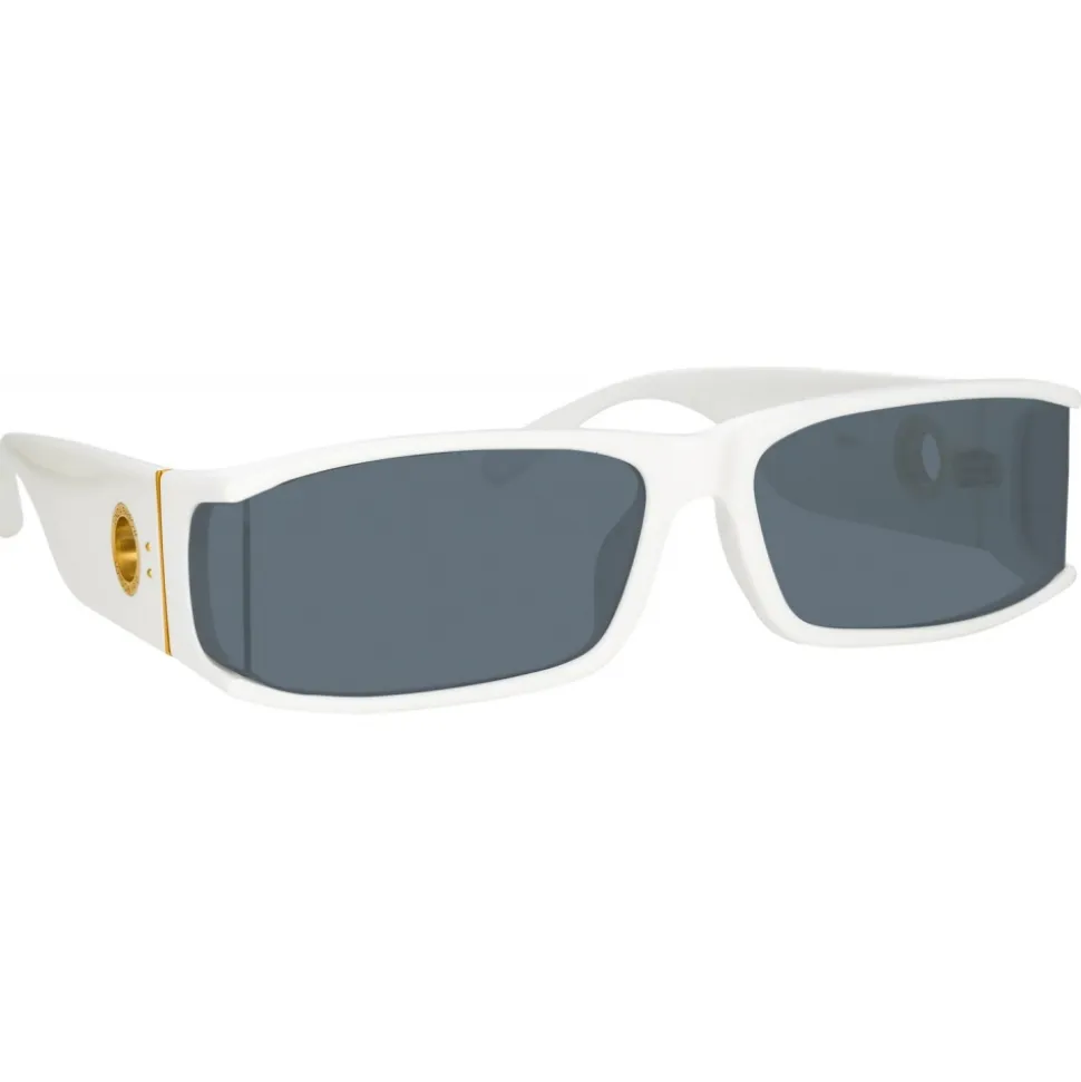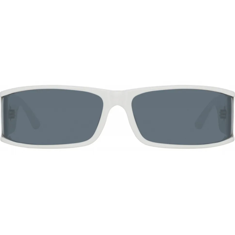 The sleek rectangular silhoutte of the Mya sunglasses play with sharp angles to create form and add intrigue. Sculpted from optic white acetate the frame holds a right angled lens which extends to a side shield detail. The temple bears the LINDA FARROW signature titanium plated eyelet. Grey nylon lenses offer anti-glare and 100% UV protection. Laminated acetate temple tips provide comfort to the wearer.