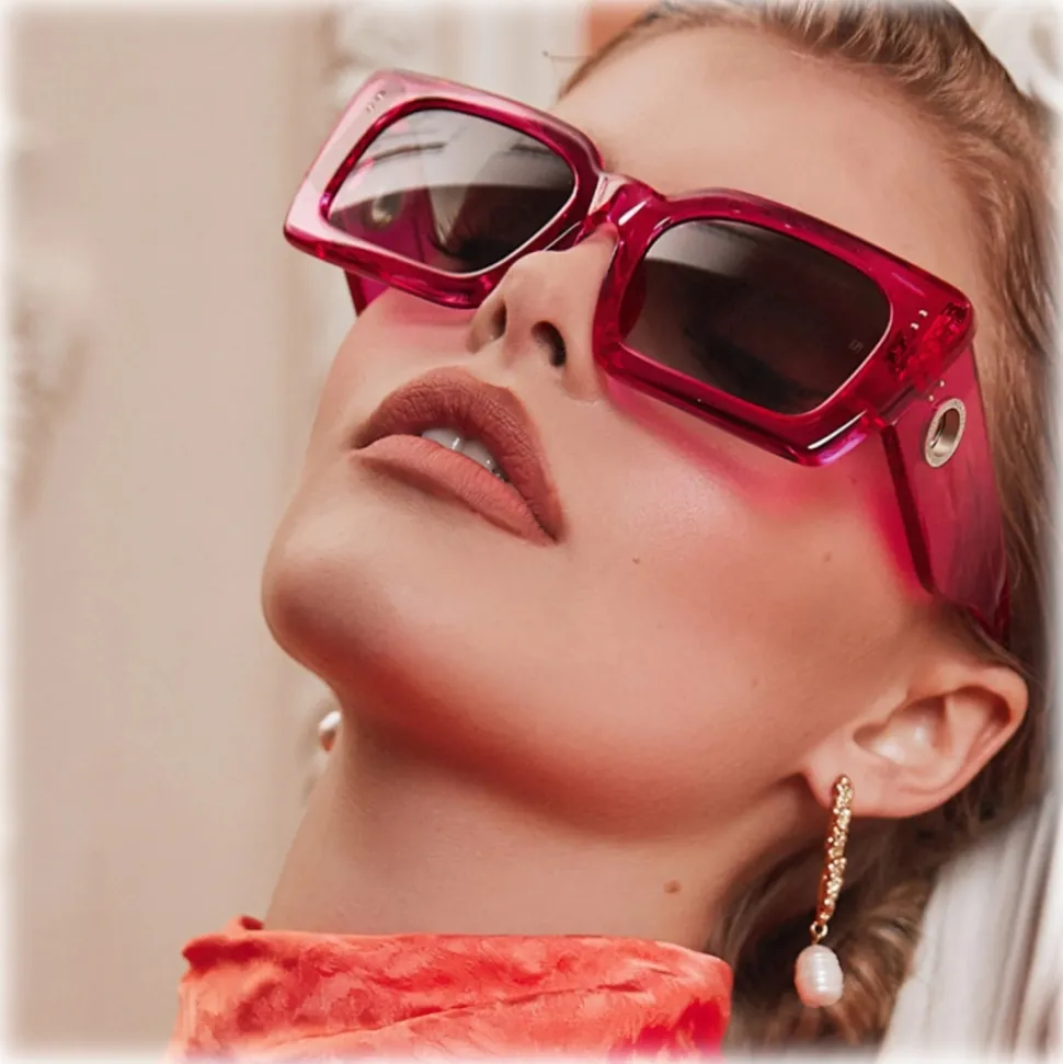 These glossy framed sunglasses from the LINDA FARROW collection are effortlessly chic. Sculpted from daring fuchsia acetate the highly polished rectangular frames have a slight angle giving them an intriguing edge.
