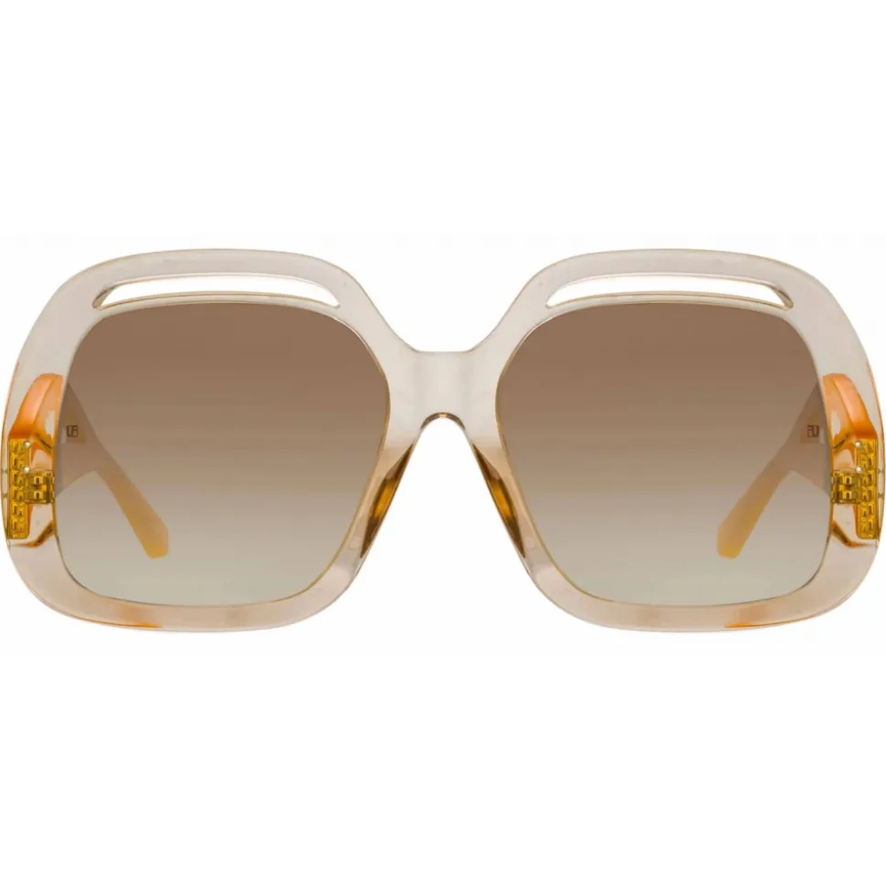 A bold exploration of geometric shapes and negative space the Renata sunglasses from the LINDA FARROW collection exude a playful 70s spirit. Crafted from translucent ash acetate, the statement frame features striking cut out detailing paired with contrasting orange temples. Sculpted nose pads and temple tips provide a comfortable fit. The frame is fitted with mocha graduated lenses which offer anti-glare and 100% UV protection. Finished with 22 carat light gold plated titanium hardware.
