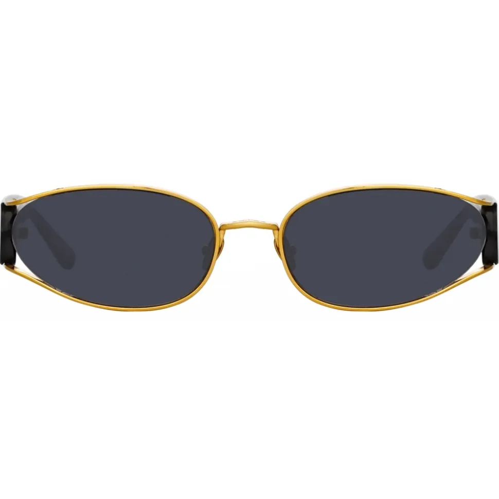 Shelby brings statement energy as a key piece for the season. The sunglasses are spun from 22 carat yellow gold plated titanium which sweeps back from the lens to reveal a cat eye silhouette within the frame.