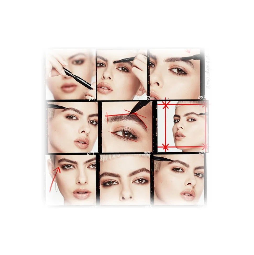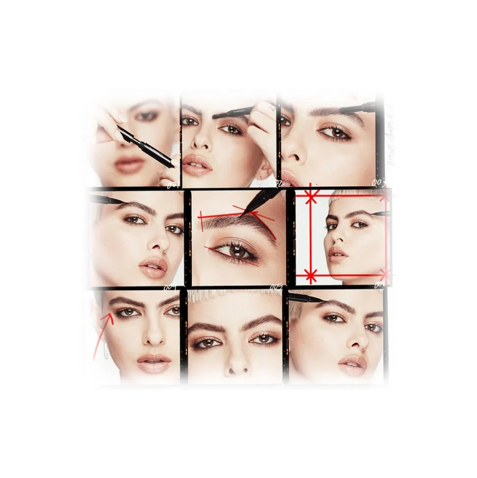Double-ended brow tool. In the shape of a pen to color and define the eyebrows and with the other end equipped with a sponge to blend and shape them.