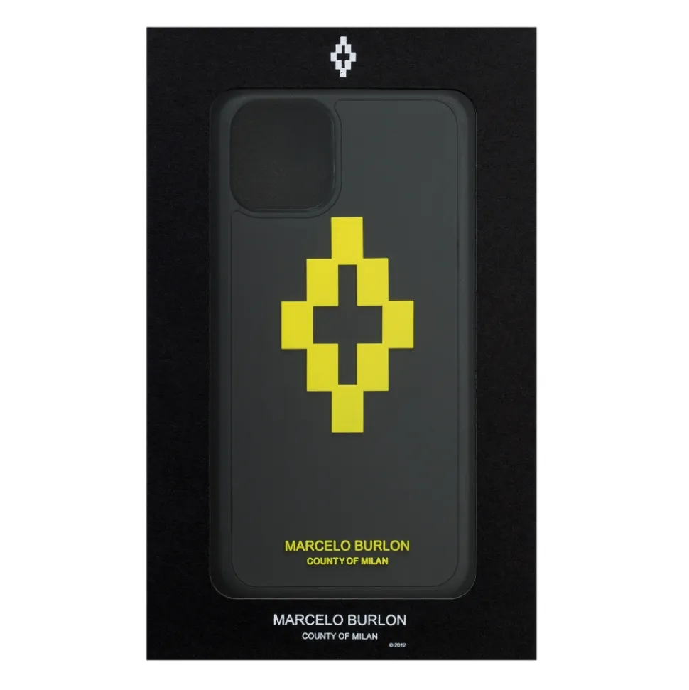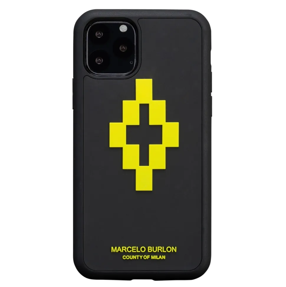 Marcelo Burlon printed iPhone 11 Pro case. Black case with 3D Cross Yellow printed embellishment. Suitable for iPhone.