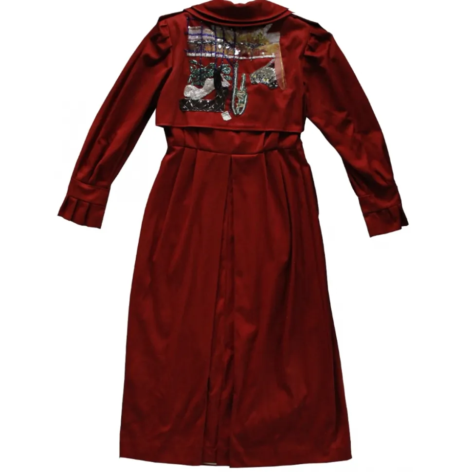 Copper red coat embroidered with a dream landscape.