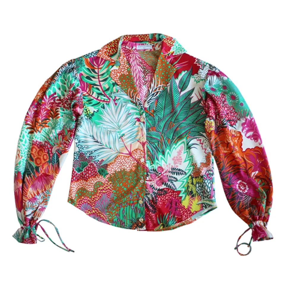 This puff sleeve shirt is made of viscose and silk from squares.